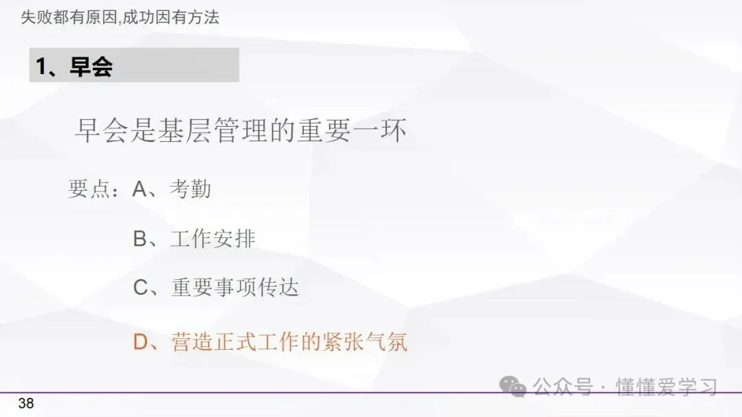 • 早会:进行教导、理念传达和目标设定,确保团队成员对当天的工作有清晰的认识和共同的目标。