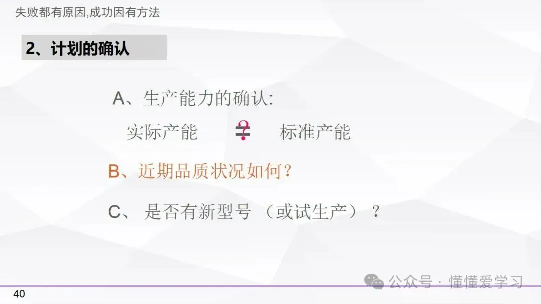 • 计划的确认:根据生产能力、品质状况以及新型号或试生产的需求来确认和调整生产计划。