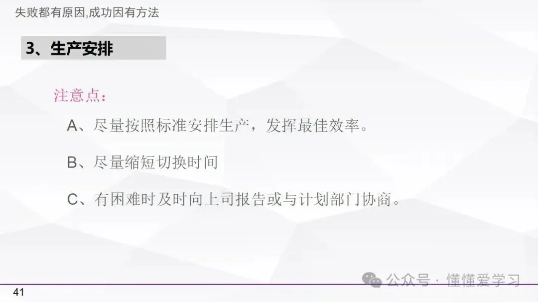 • 生产安排:按照标准安排生产流程,努力缩短切换时间以提高生产效率。
