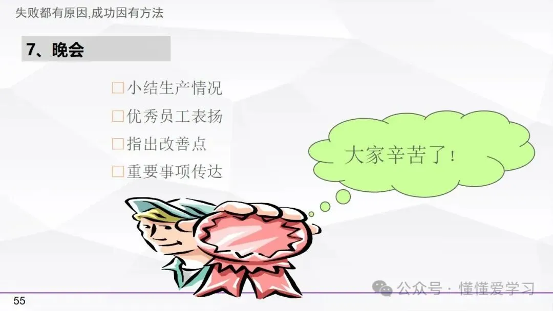 • 晚会:总结一天的工作成果和经验教训,为接下来的工作提供参考和改进方向。