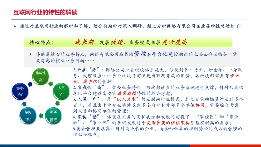 在业务狂飙突进、架构日新月异的互联网行业,搭建一个集团化的数字化管控平台,无异于在高速行驶的列车上更换引擎。近日,一份为某快速成长的互联网集团(文档中称“网络有限公司”)量身定制的《数字化管控平台及信息化治理服务体系建设方案》全景图被披露。该方案直指互联网企业“业务杂、集成高、人员广、架构繁、资金管控要求高”五大核心痛点,系统性地规划了一条从统一蓝图到分步落地的数字化升级路径。