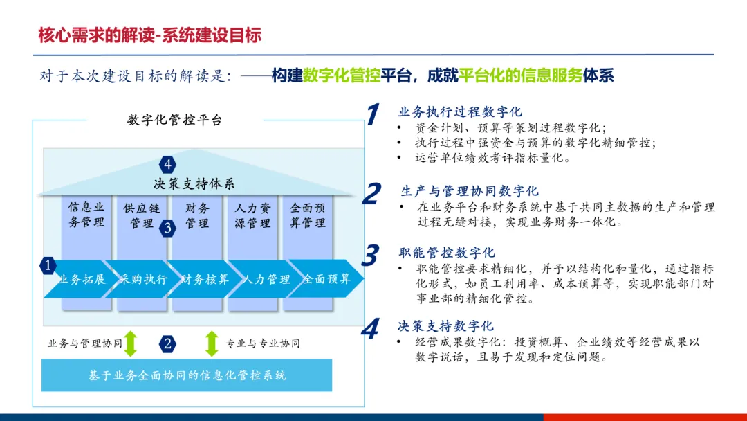 本方案的核心目标明确:构建一个“统一规划、统一平台、统一管理”的数字化管控平台,成就平台化的信息服务体系。其方案主体可概括为“一个建设目标、两条实施路径、五大解决方案支柱”,旨在实现业务执行、生产协同、职能管控、决策支持四大层面的全面数字化。