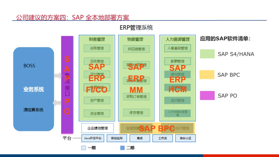 架构:核心财务、供应链、薪资考勤采用本地部署的SAP S/4HANA,享受其实时数据平台的优势;而人力资源管理的大部分功能(员工中心、绩效、招聘等)则采用云端SAP SuccessFactors。通过SAP PO作为集成总线。