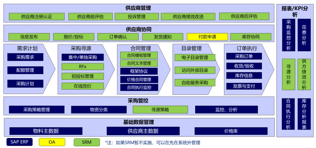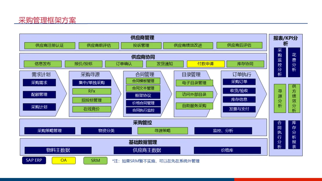 供应链管理:重点构建全过程的供应商管理体系(从准入、协同到绩效评估)和灵活的采购策略(支持统谈统签、统谈分签等多种模式)。方案特别考虑了从简单的手工订单管理起步,未来可集成Oracle SRM以实现在线寻源与竞价。