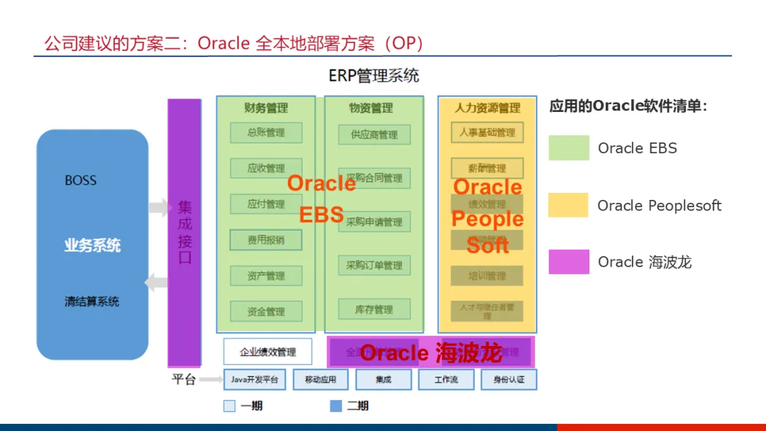 架构:核心的财务、供应链模块采用本地部署的Oracle EBS,以保障复杂业务定制的灵活性与核心数据安全;而人力资源、预算管理模块则采用Oracle云产品(HR云、预算云),享受其快速迭代和易用性。通过ESB企业服务总线集成内外系统。