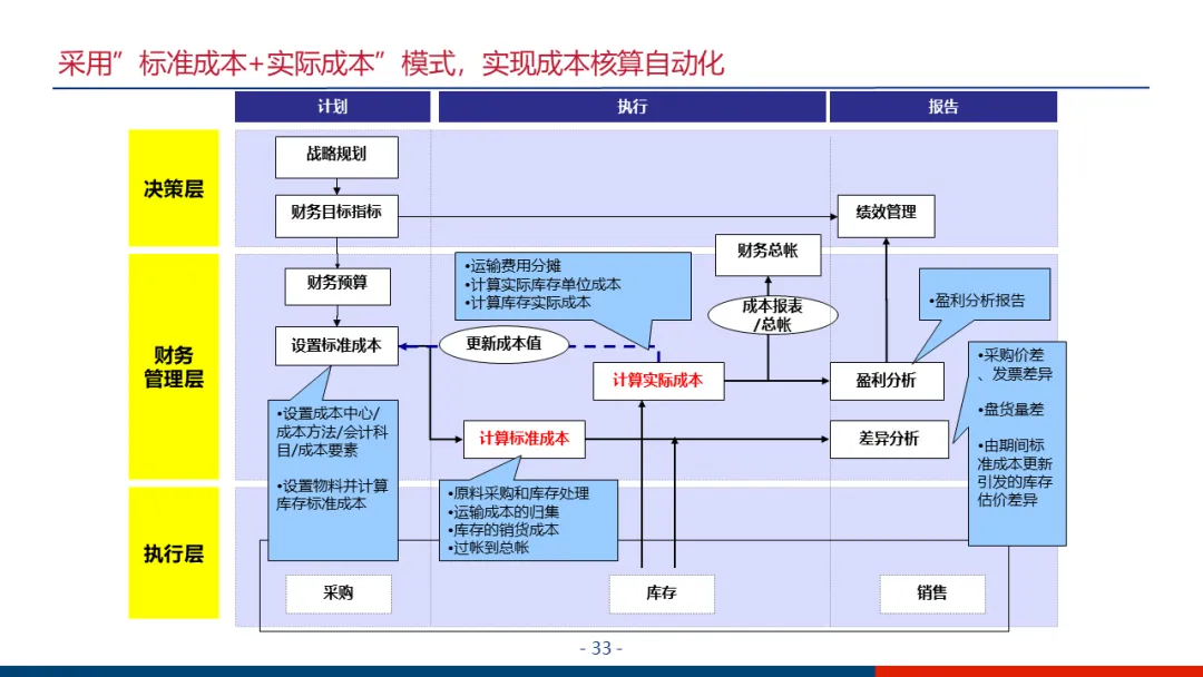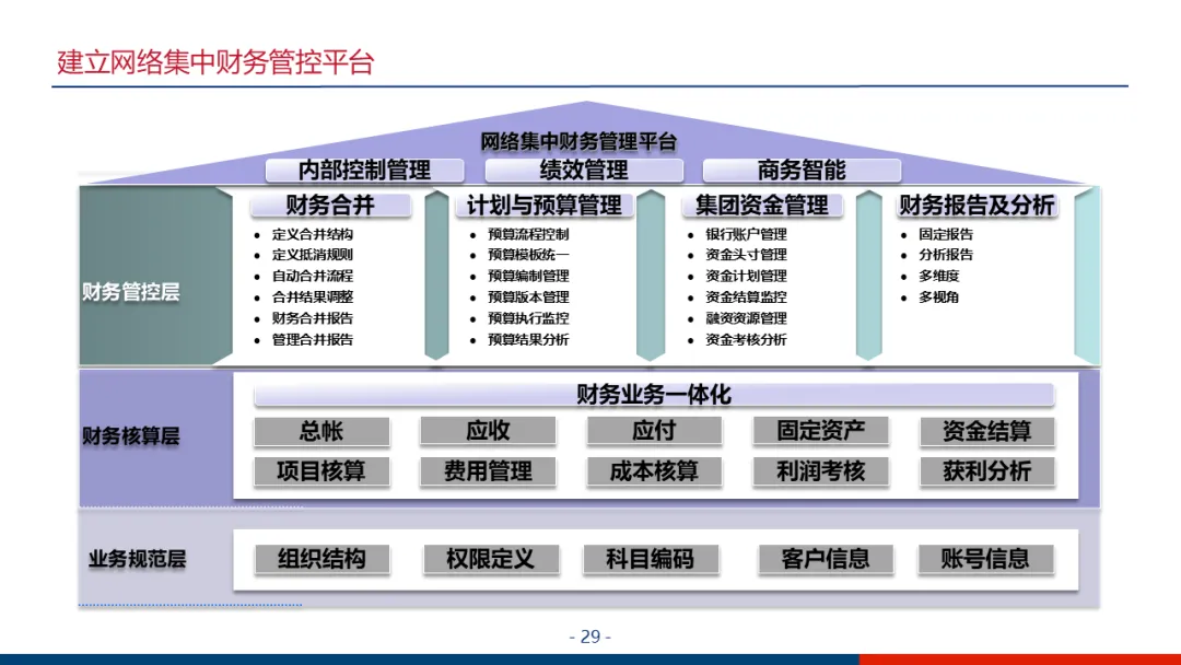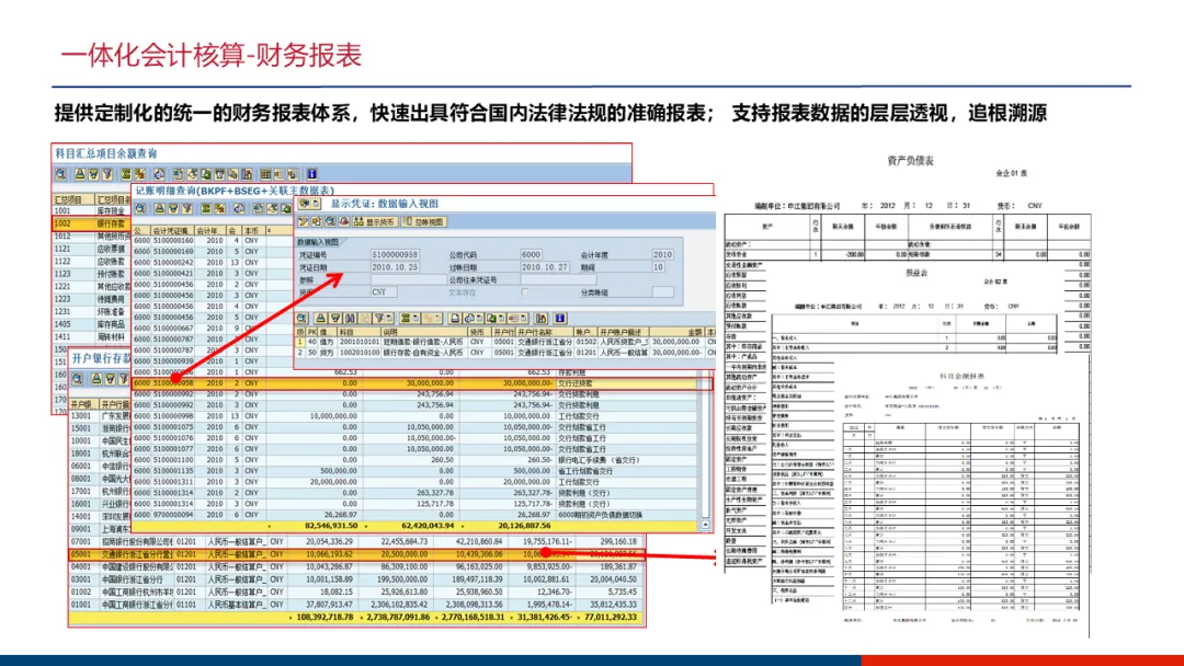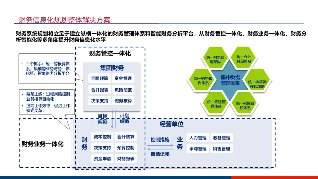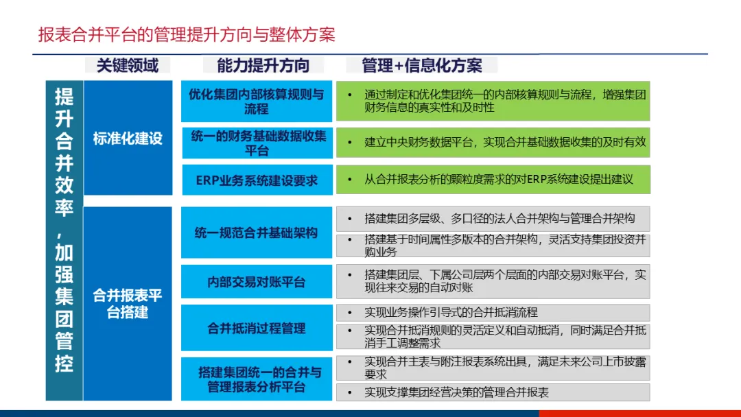 财务管控:核心是建立“六统一”的集中管控平台(统一科目、账套、流程、凭证、报表、权限)。重点实现业务财务一体化,使业务数据自动生成财务凭证;强化资金计划与管控,通过银企直连实现收支监控;设计复杂的内部往来交易自动对账方案,提升合并报表效率。