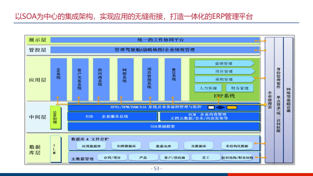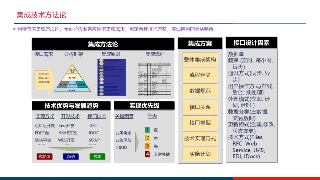 面对互联网企业前端业务系统繁多的现状,方案将系统集成视为项目成败关键。建议采用以SOA(面向服务架构)为中心的集成架构,明确推荐使用SAP PO或Oracle ESB作为企业服务总线,对散点接口进行统一规划、规范和管理,确保核心ERP平台与OA、BOSS、资金、考勤等数十个系统实现无缝衔接。