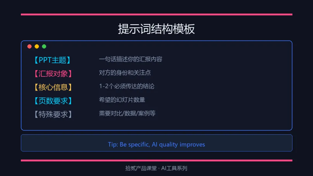 今天不推荐新工具,就讲三件事:怎么让AI听懂你的需求、怎么让PPT逻辑在线、怎么让演讲有记忆点。学会这三点,随便哪款AI工具都能帮你做出80分以上的汇报方案。