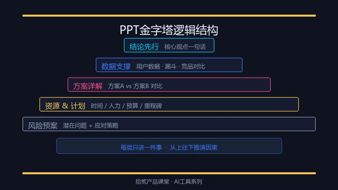 这里推荐一个被麦肯锡验证过的结构——金字塔原理,用在PPT里非常顺手。