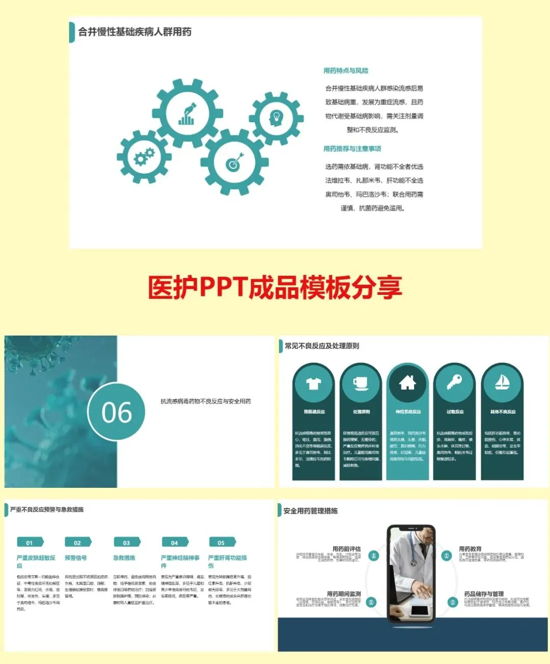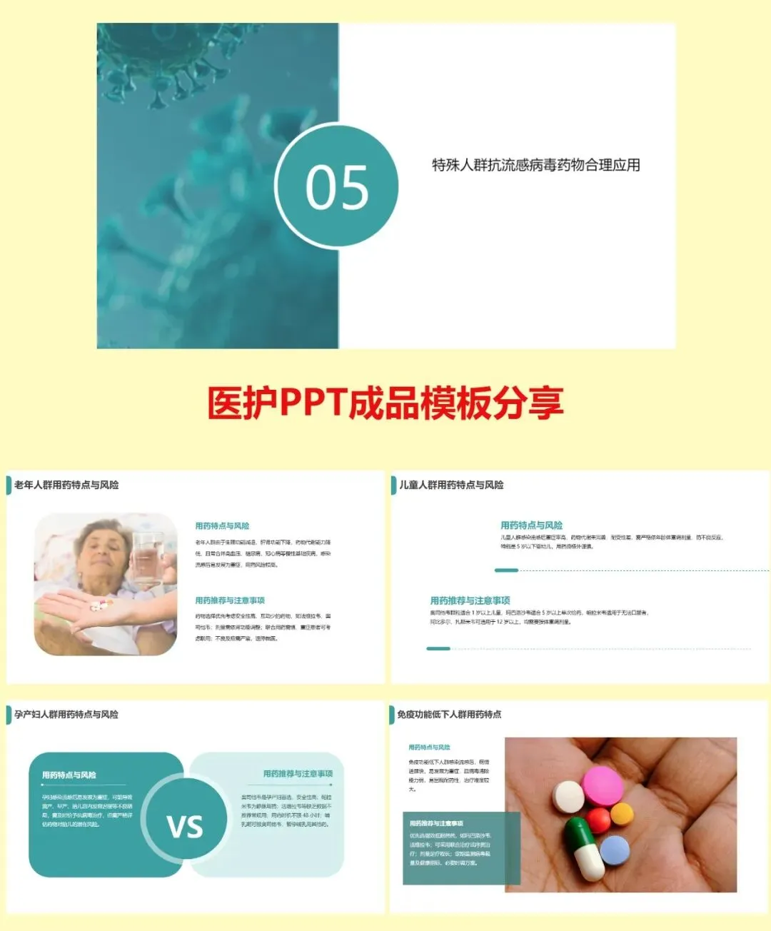 第五,特殊人群用药。老年人按肾功能调量;儿童按体重给药,奥司他韦可用于 1 岁以上,玛巴洛沙韦用于 5 岁以上;孕产妇首选奥司他韦;免疫低下与重症者可联合或延长疗程。