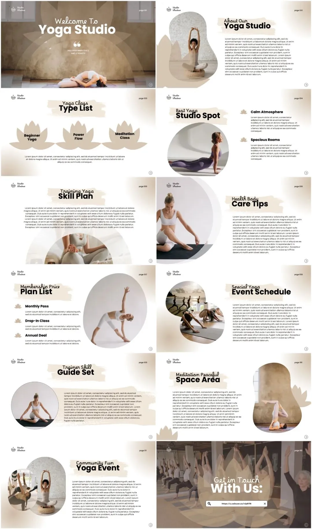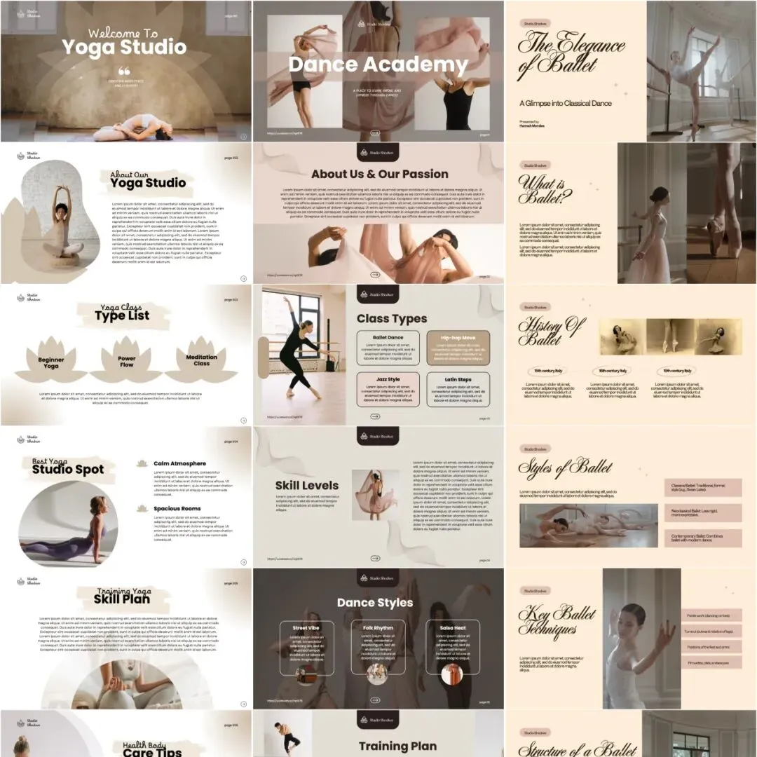 以米白、淡粉、浅棕等柔和色调为主,搭配瑜伽体式、舞蹈动作、芭蕾舞姿的高清图片,每一页都像是从 “高端健身艺术杂志” 中截取出来的。外行看了会觉得 “哇,好有艺术感和活力”,内行则会赞叹 “配色和排版都很专业,很懂行”,瞬间树立起 “专业且有魅力” 的形象。