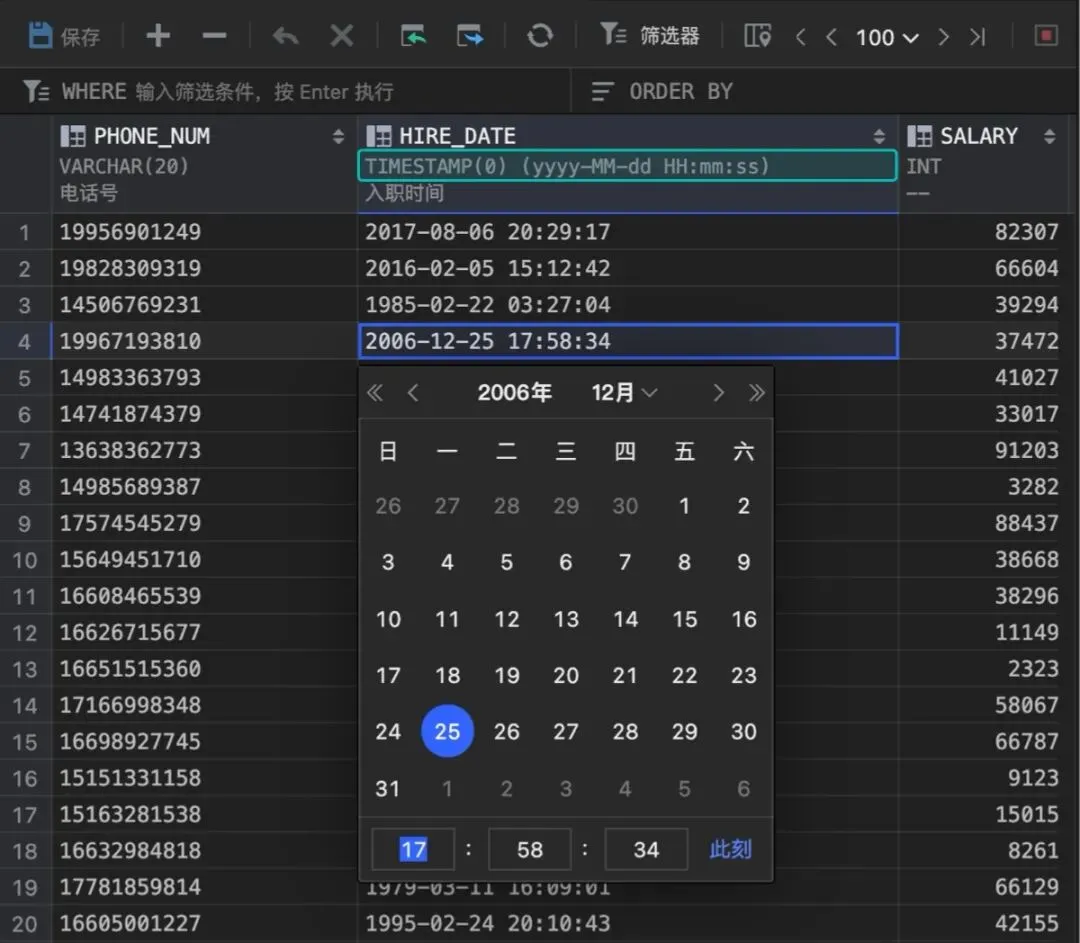 日期时间类型是日常开发中使用频率最高的字段类型之一。在 SQLark 中查看时,表头会提供标准格式展示,例如:DATE(yyyy-MM-dd HH-mm-ss),方便用户快速核对数据格式;编辑时可使用可视化的日期/时间选择器,通过点选操作完成输入,避免格式错误。