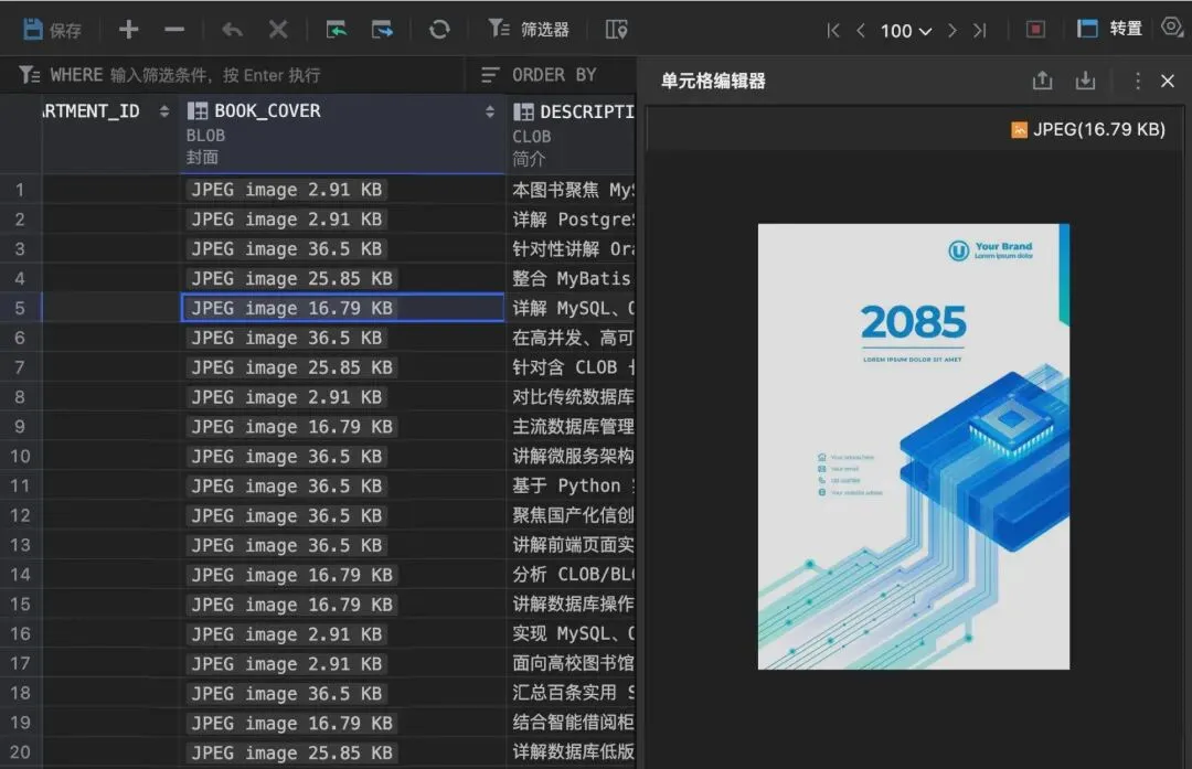对于图像文件(image/png/jpg/gif),表格中直接显示文件类型与大小(如:JPEG image 16.79KB);双击即可在单元格编辑器中预览图像,并支持连续切换单元格,以快速查看不同记录的图像内容。