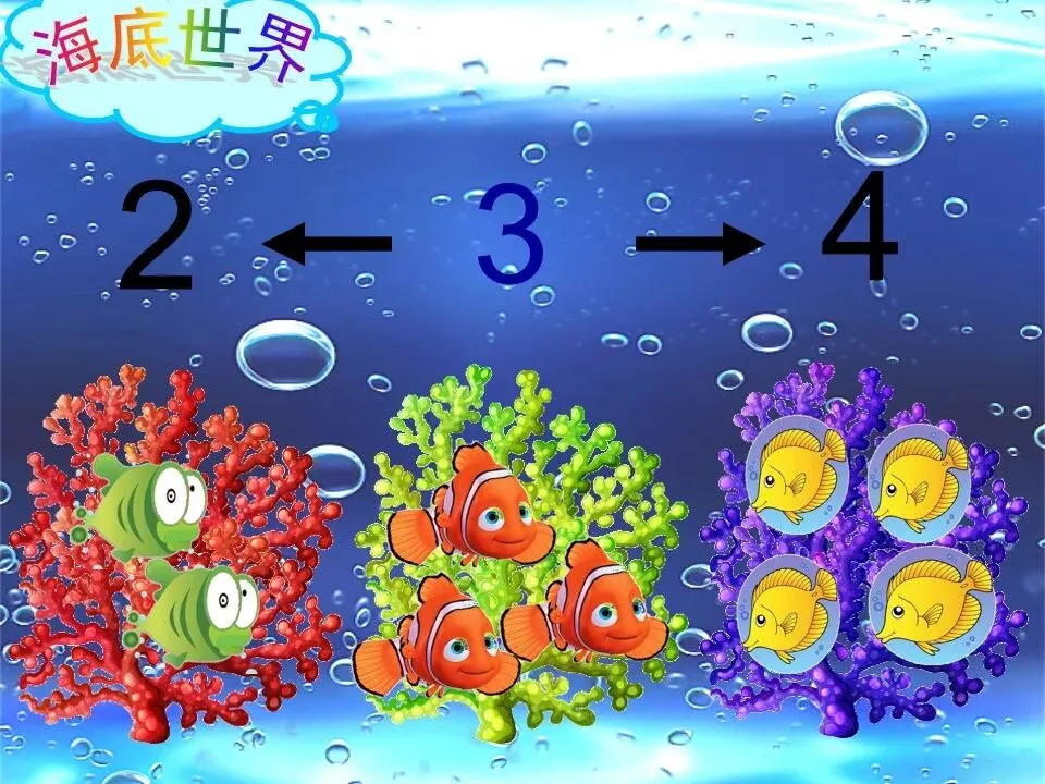 二、结合课件观察对比,引导幼儿在儿童乐园——游乐场、海底世界的情境中探索2、3、4的相邻数,理解三者之间数量多少、大小邻居、位置前后的关系。