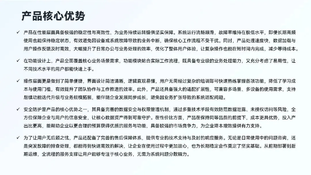 那么我们要做的第一步一定是梳理信息,只保留关键词句,删掉修饰性语句,然后将信息分类提炼为几类要点,再采用并列式局部,页面就清晰整洁了不少。