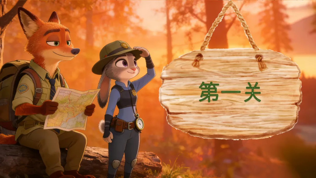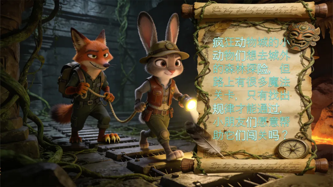 教师:“小朋友们,今天动物城的朱迪和尼克想去城外的森林探险,但是路上有好多魔法关卡,只有找出关卡里的秘密规律,才能顺利通过。它们想邀请聪明的小朋友们当小助手,一起闯关,你们愿意吗?”