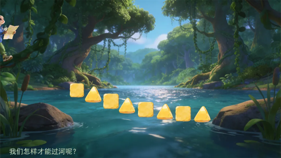 请幼儿轮流发言,点击 PPT出现石头形状,验证正确后,发放第一枚 “过河徽章”,表扬幼儿:“你们太厉害啦,找出了形状规律,帮助小动物成功过河!”