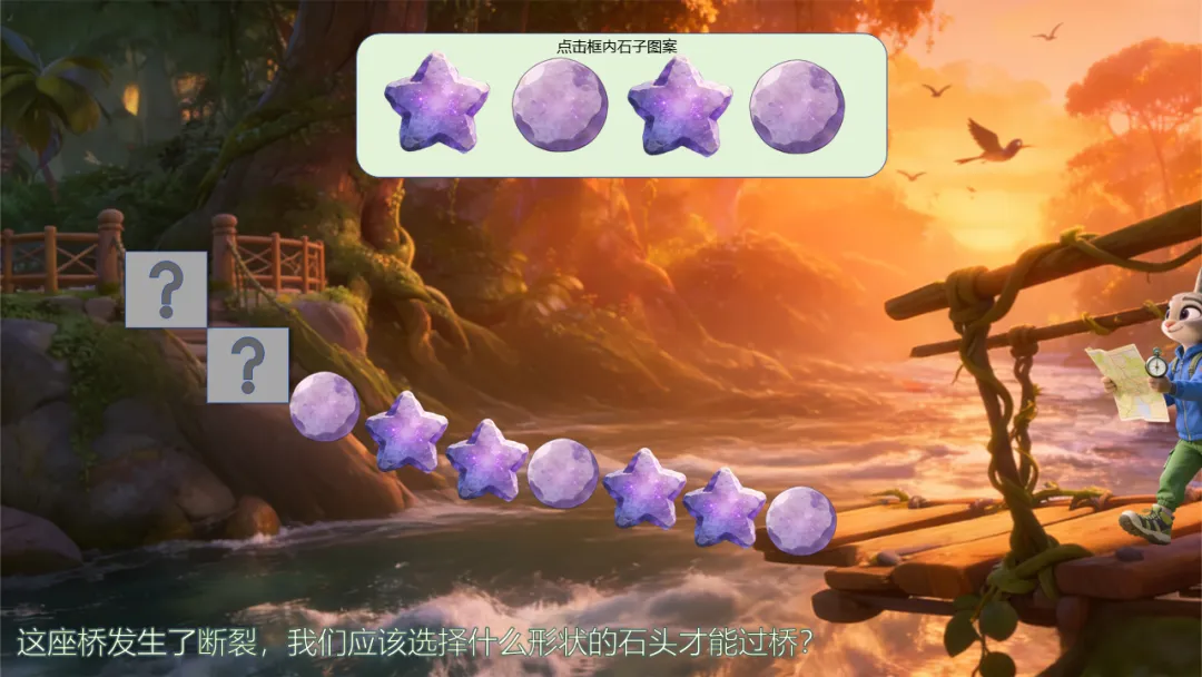 教师:“尼克和朱迪又遇到了麻烦,这次木桥中间断裂了,让我们一起来看看,这次桥上的石头是什么规律排列的呀?