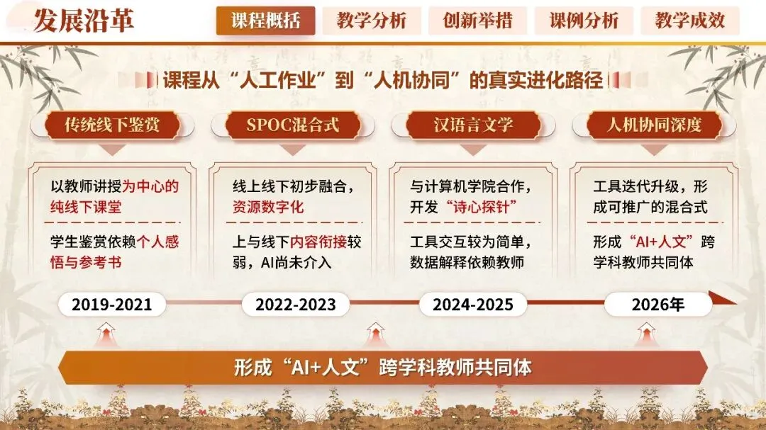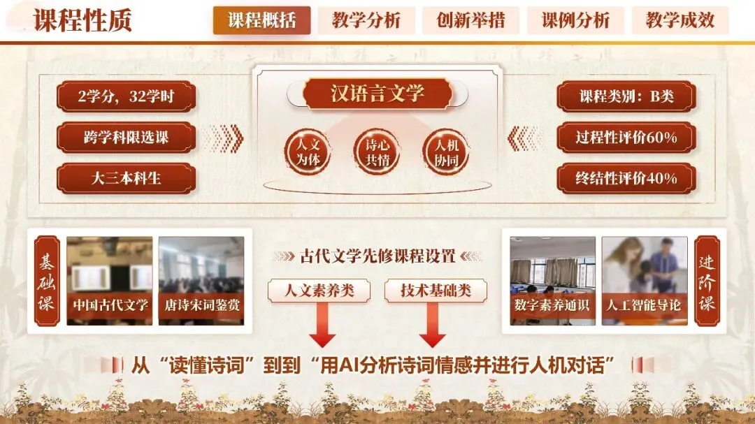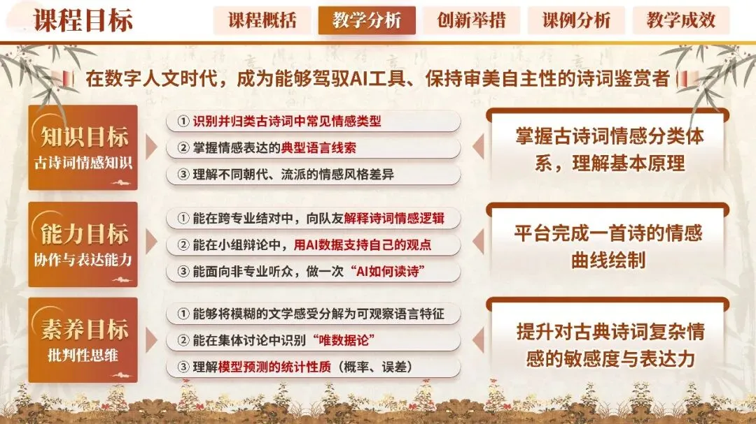 1.课程定位瞄准新文科建设中“科技与人文深度融合”的发展方向,以数据驱动诗词教学为切入点,将计算思维与传统诗教相结合,契合国家关于中华优秀传统文化创造性转化、创新性发展的战略要求,致力于培养兼具人文情怀与数据素养的复合型人才。