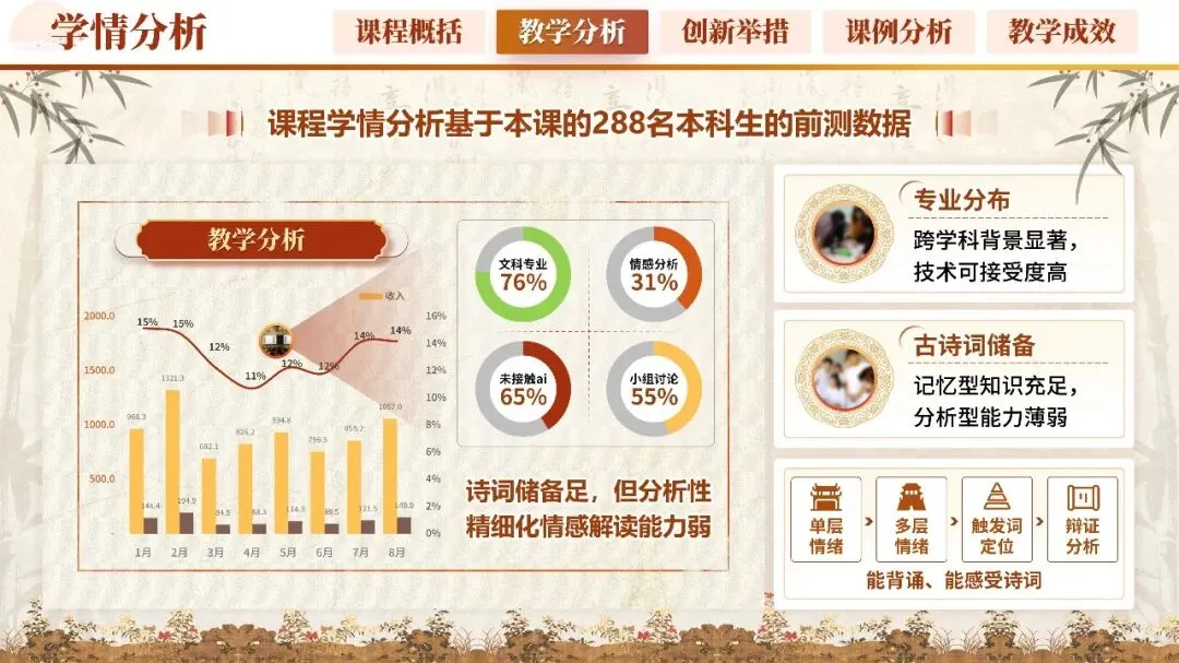本项目聚焦“诗词教学中人文感知与数据思维难以融合、传统解读缺乏量化支撑”的教学痛点,通过量化韵律特征、可视化情感脉络、对比风格演变等路径,实现人文素养与数据素养的双重提升,为新文科背景下跨学科课程改革提供创新范例与实施路径。