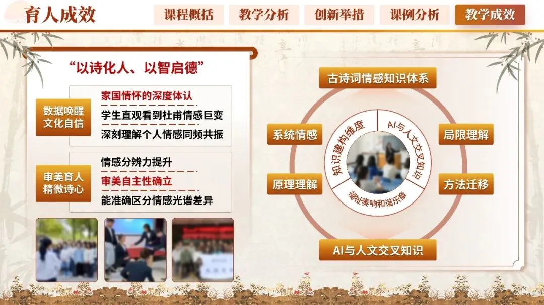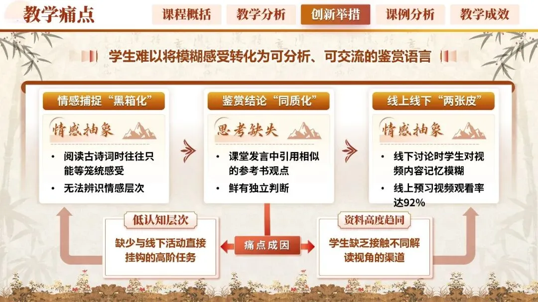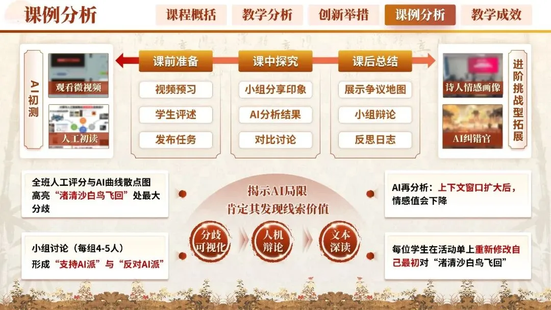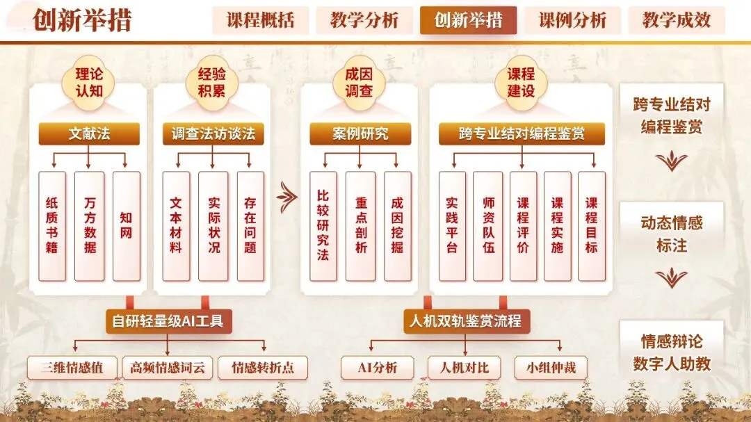 2.核心创新围绕“数据寻韵话诗词”核心理念,系统构建三大创新路径:一是内容重构,将传统诗词知识体系与可视化分析等技术模块有机整合;二是方法创新,开发“量化寻韵—数据证诗—算法探情”三阶教学法;三是评价改革,建立“人文解读报告+数据分析作品+跨学科小组展示”的多元评价体系。