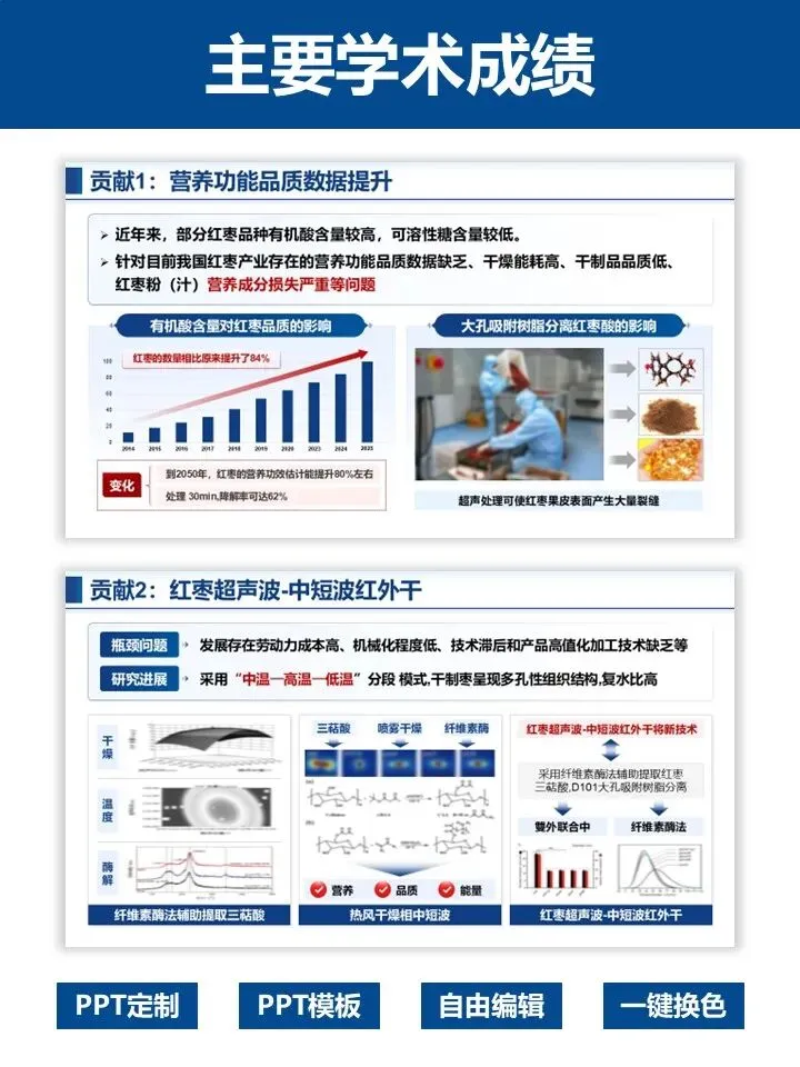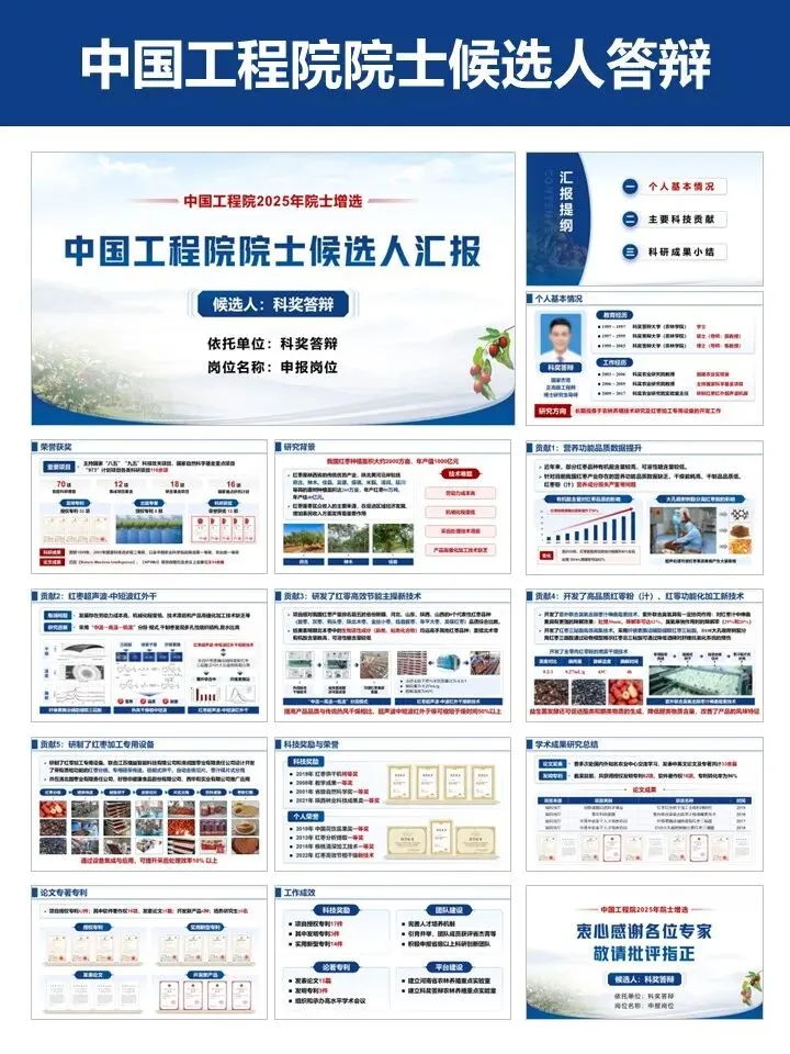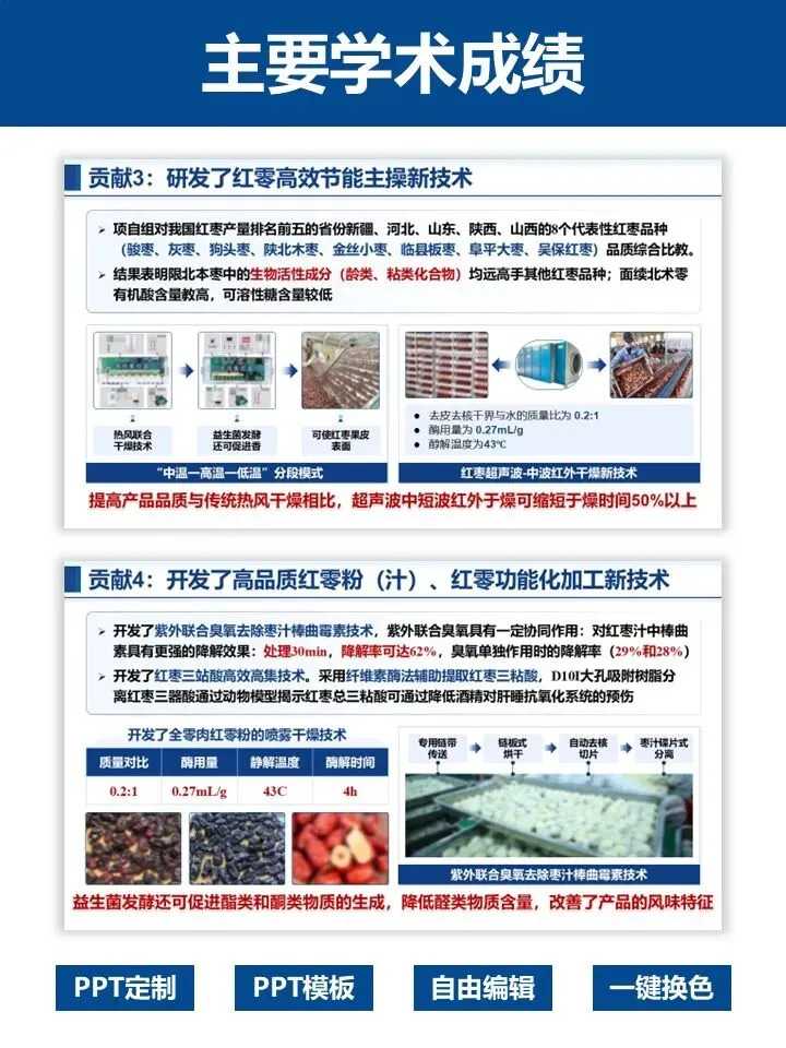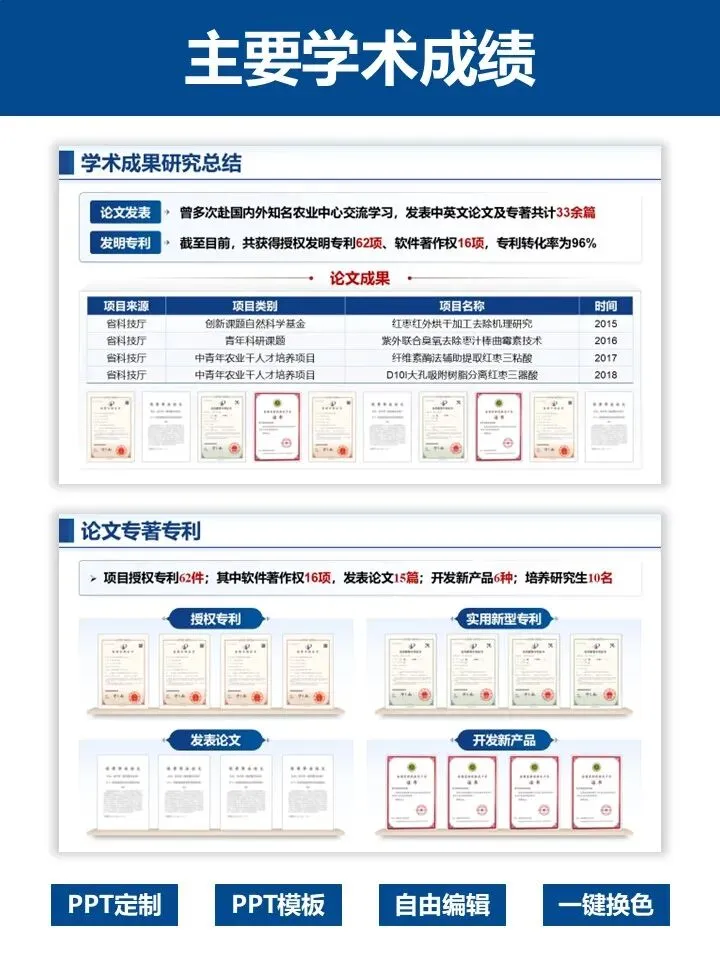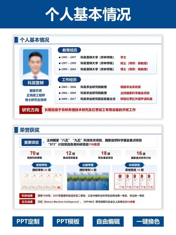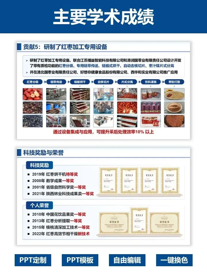 模板结构完整,从个人基本情况、主要科技贡献到科研成果总结,逻辑清晰、排版专业,蓝白主调沉稳大气,尽显学术风范。涵盖红枣加工等农业领域案例,可一键替换内容,自由编辑、快速换色,轻松适配不同学科方向。
