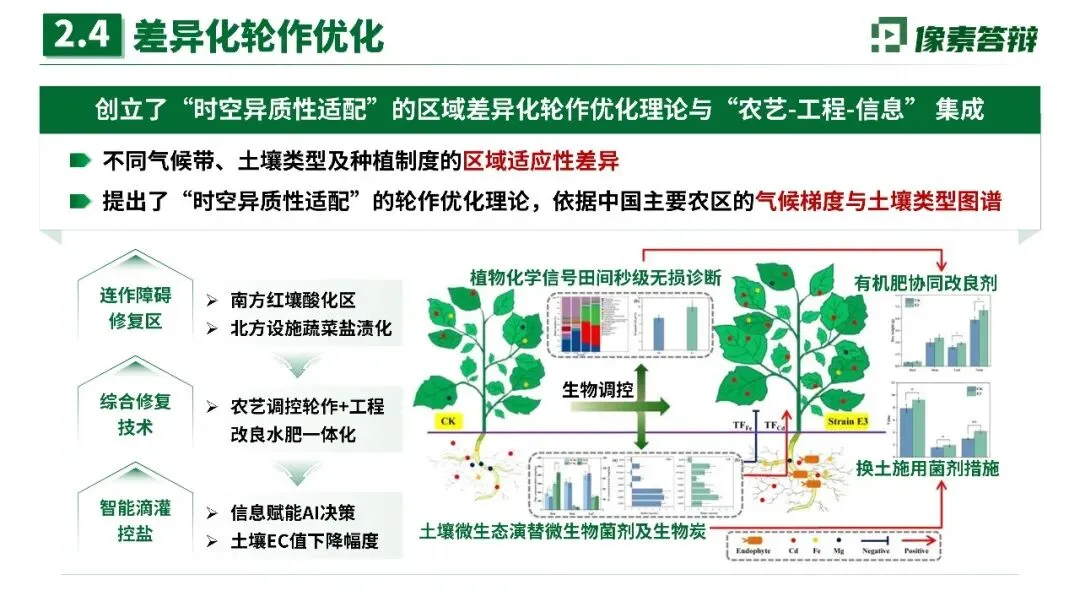 模式集成:创立“时空异质性适配”区域差异化轮作优化理论,集成“农艺-工程-信息”三位一体修复技术,在南方红壤酸化区、北方设施蔬菜盐渍化区取得显著成效(土壤EC值大幅下降,有机质提升)。