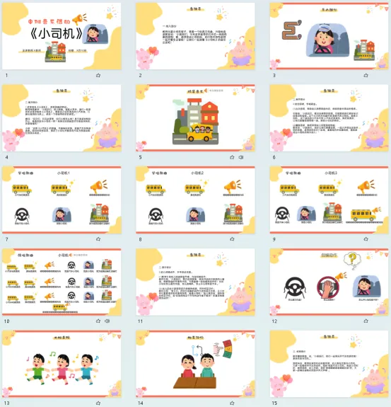 1.感受歌曲中的欢快旋律,演唱时能表现出小司机的高兴心情。