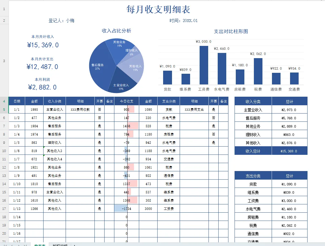 ……好了,这套财务人员常用的公司财务收支明细表模板,设置有函数公式,直接编辑修改套用即可。特别是月底做报表比较多的财务人员,用现成的收支明细表模板,能省不少繁琐的事。🔽🔽🔽