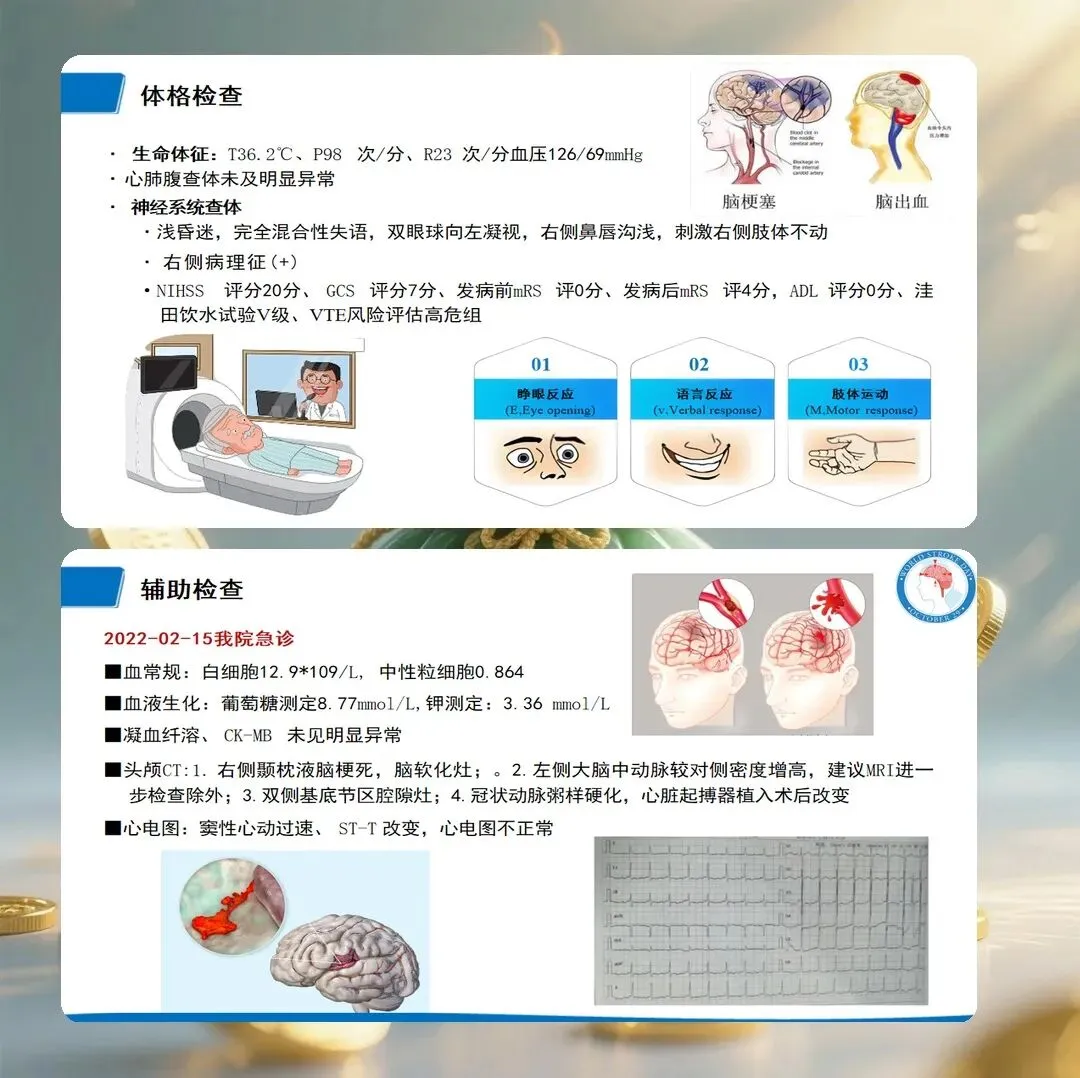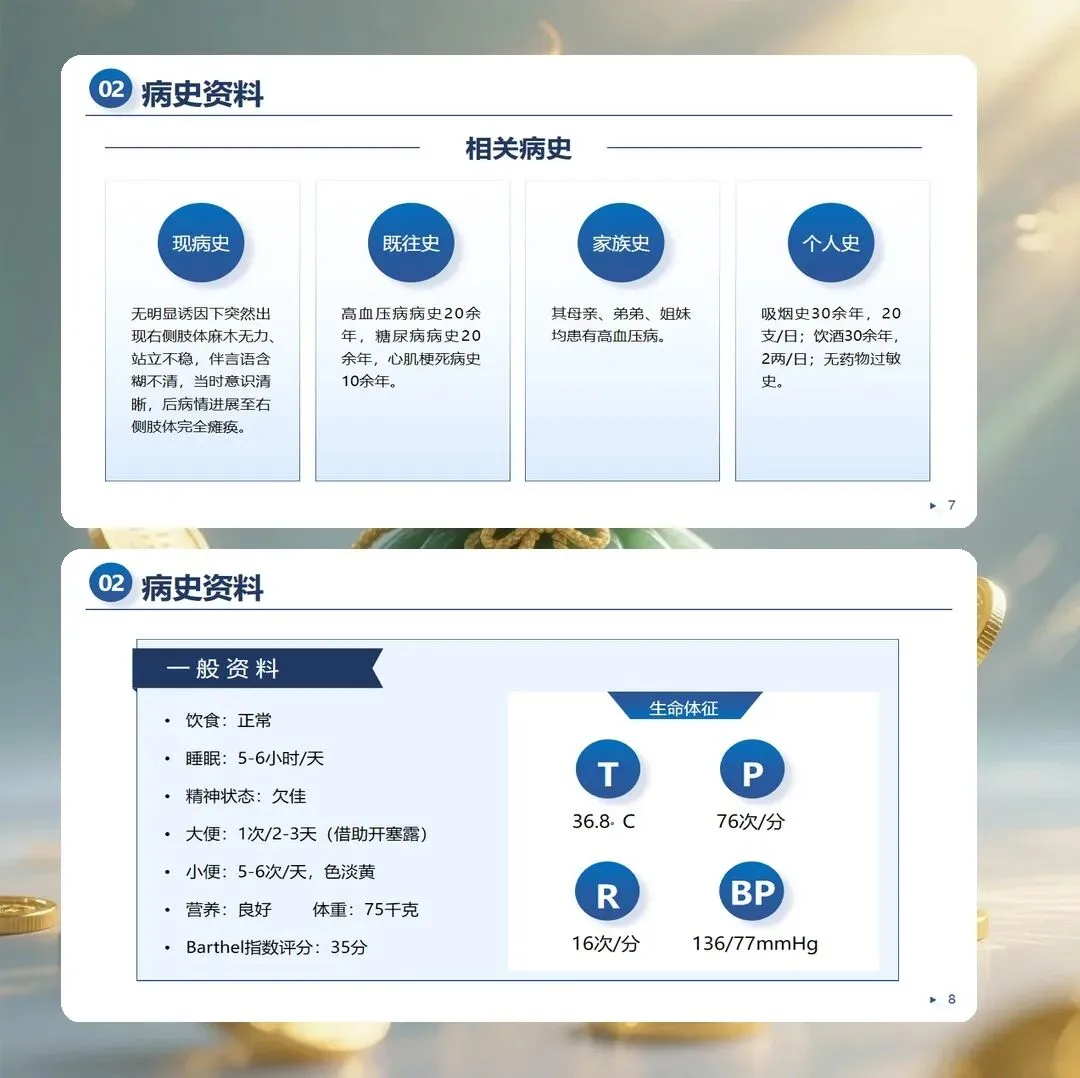 脑梗死是神经内科最常见的疾病之一,具有高发病率、高致残率、高复发率的特点。护理查房是提升护理质量、促进护士专业成长的重要教学活动。本文以一例脑梗死患者的护理查房为例,系统阐述护理评估、诊断制定、干预实施与效果评价的全过程。护理评估是护理查房的基础环节。责任护士首先汇报患者的一般资料、现病史、既往史、入院时的生命体征与神经系统查体结果。专科评估方面,采用美国国立卫生研究院卒中量表(NIHSS)评分,入院时为8分,提示中度神经功能缺损。吞咽功能评估采用洼田饮水试验,结果为3级,存在吞咽障碍风险。压疮风险评估采用Braden评分,结果为14分,属于高风险。跌倒风险评估采用Morse评分,结果为55分,属于高风险。自理能力评估采用Barthel指数,结果为35分,属于重度依赖。