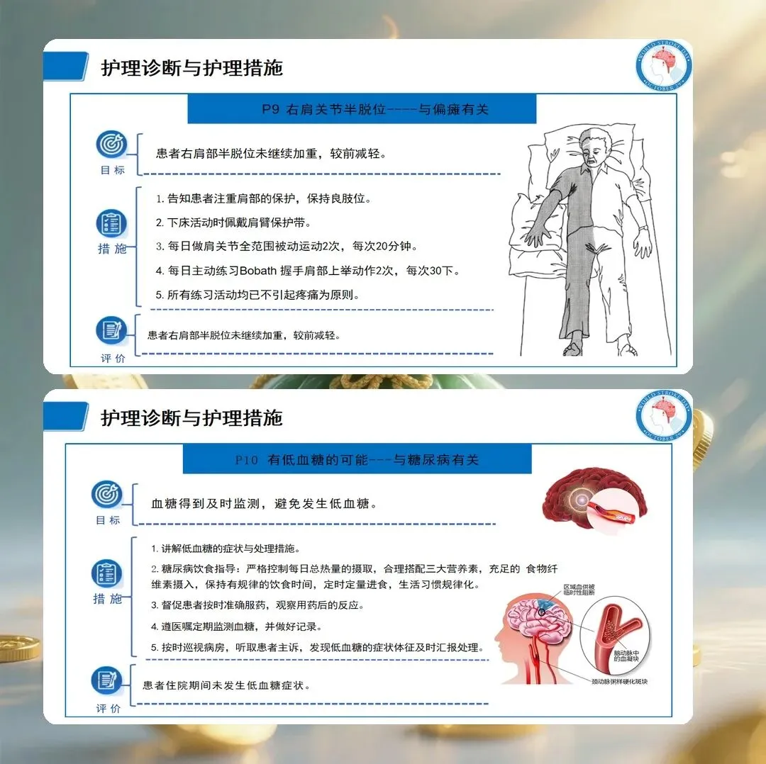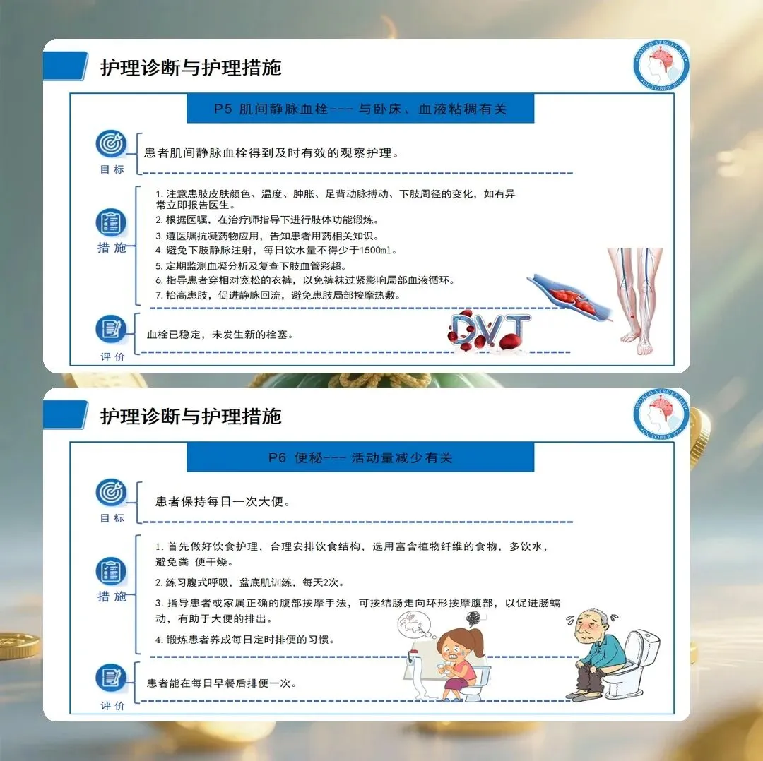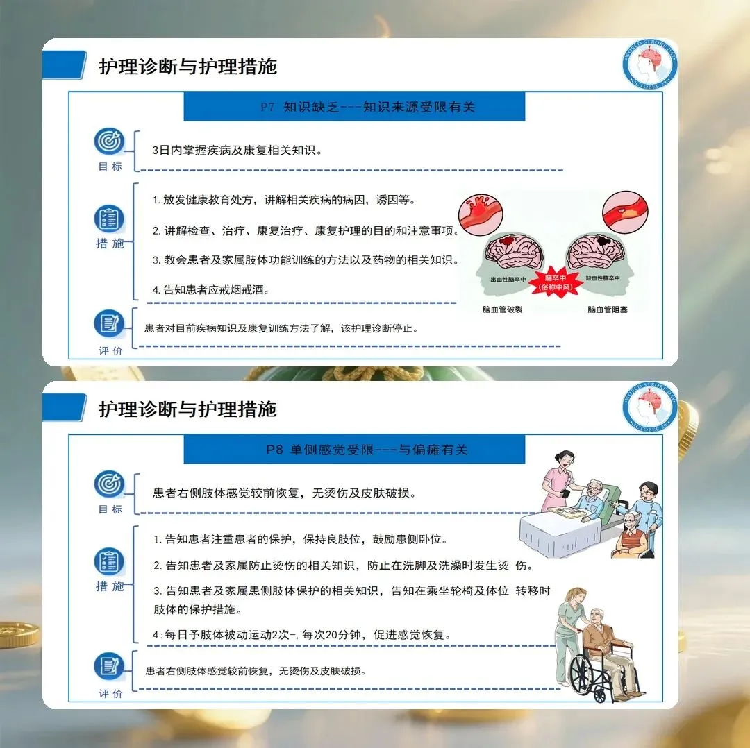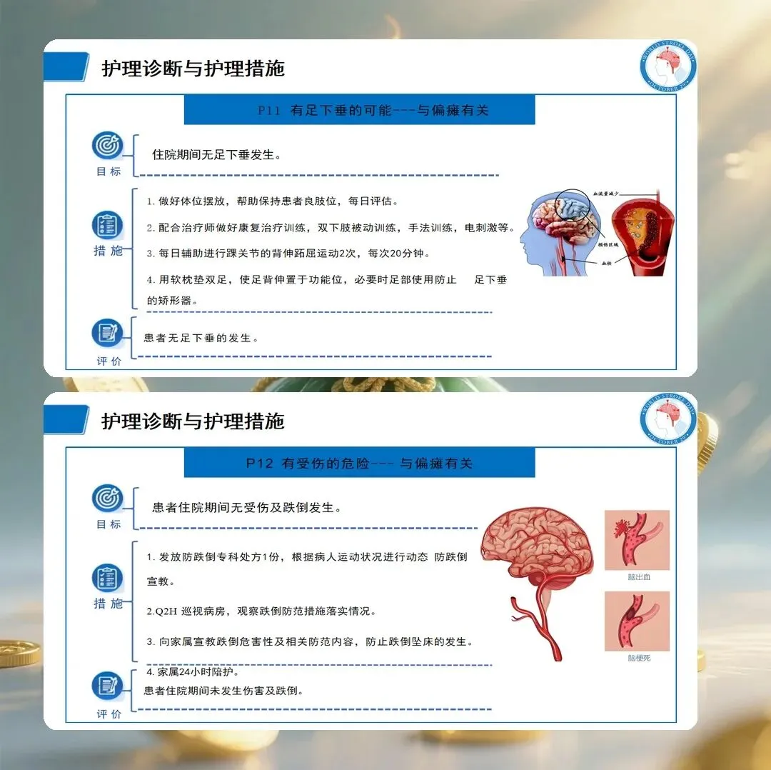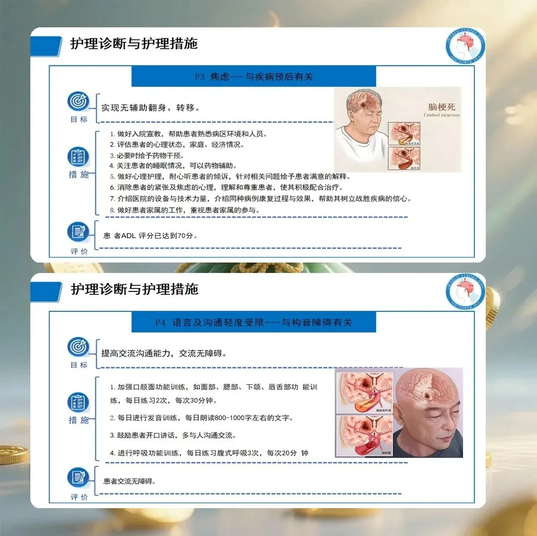 基于评估结果,提出以下护理诊断:肢体活动障碍,与脑组织缺血缺氧导致运动神经功能受损有关;言语沟通障碍,与优势半球语言中枢受损有关;吞咽障碍,与延髓供血不足导致吞咽神经功能受损有关;自理能力缺陷,与肢体活动障碍有关;有皮肤完整性受损的危险,与长期卧床、活动受限有关;有跌倒的危险,与肢体无力、平衡功能障碍有关;焦虑,与突发疾病、功能丧失有关