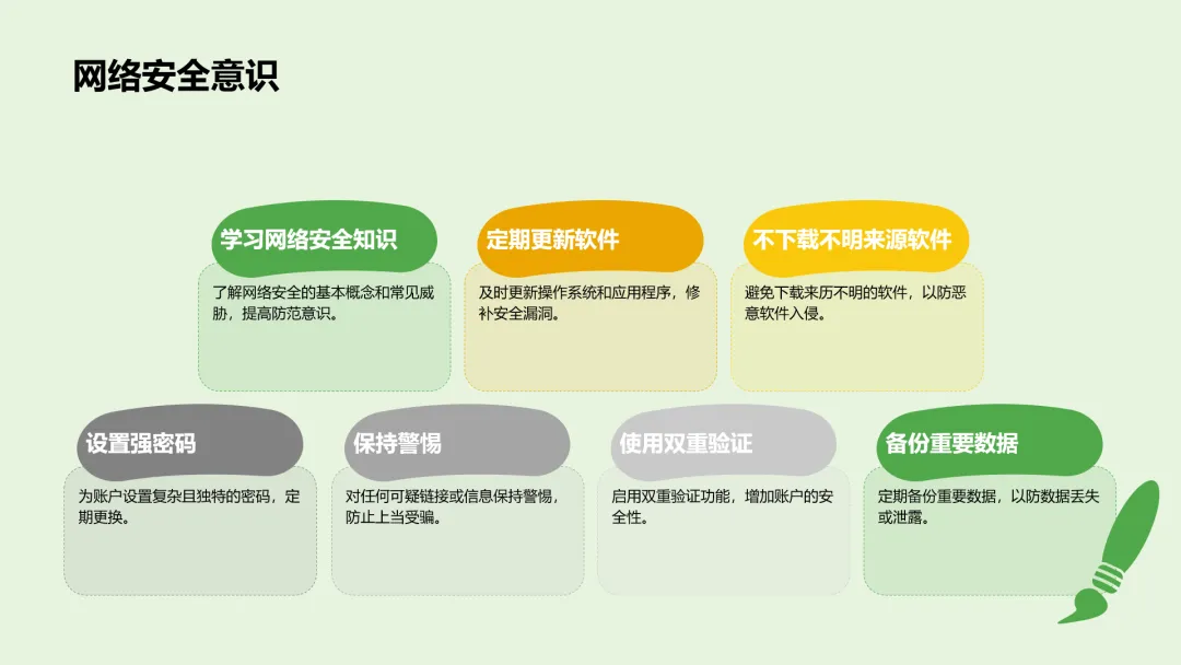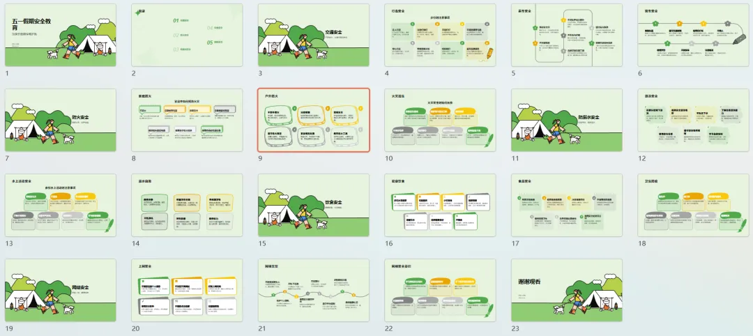 PPT 一共 23 页,涵盖交通安全、防火安全、防溺水安全、饮食安全、网络安全 5 个模块,可编辑修改。PPT 一共 16 页,内容十分完整,可直接使用,也可编辑修改。以上 PPT 模板都是可以直接下载使用的,有人需要吗?免费分享~如果你需要什么主题/类型的模板,也欢迎告诉我,记得右下角支持一下,争取日更给你们分享更多 PPT 模板、干货!