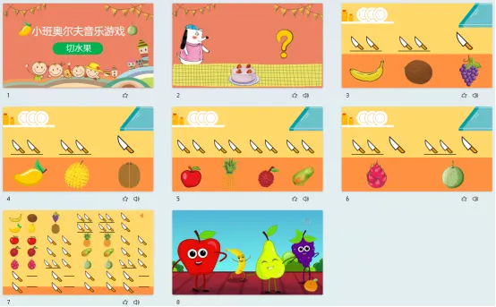 小班幼儿喜欢音乐,更喜欢音乐游戏。《切水果》是一首情绪欢快、活泼的歌曲,歌词包含了生活中常见的水果。在不同的游戏设计环节中让幼儿感受音乐、理解音乐,从而在情感上获得美的陶冶。