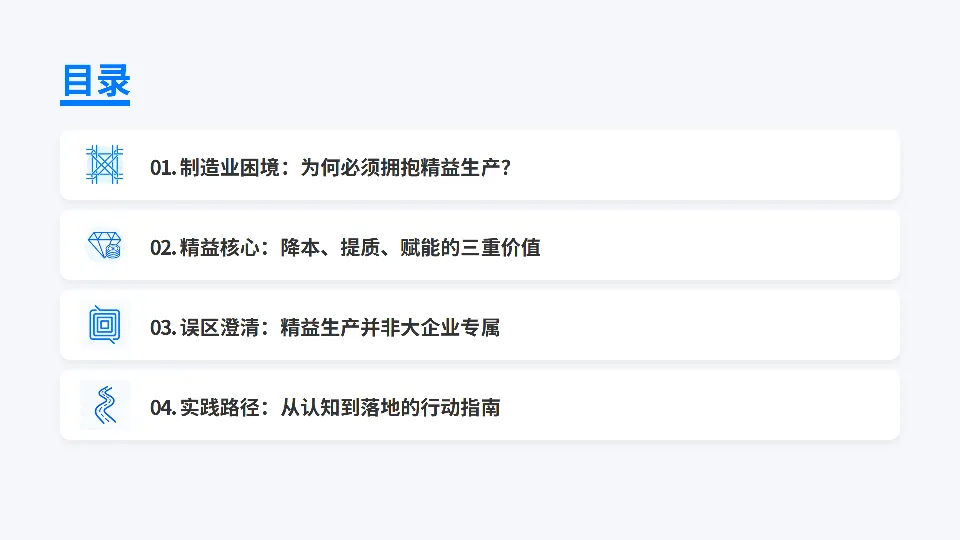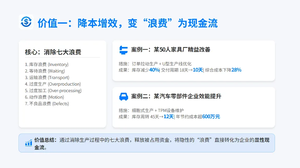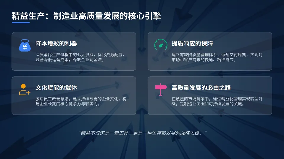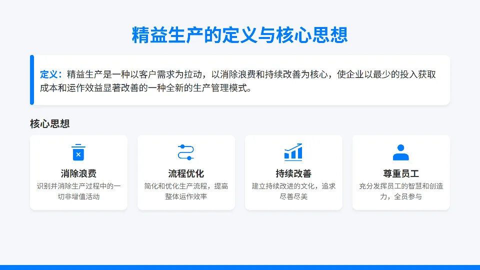 接下来通过一套精益生产培训PPT,来学习制造业降本增效与持续改善之道。