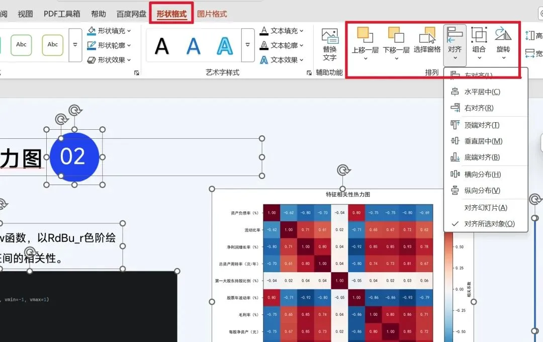 "Ctrl"选中多个对象,在【形状格式】中找到“对齐”,选择“左对齐”、“顶端对齐”或“横向分布”,让所有元素整齐划一。