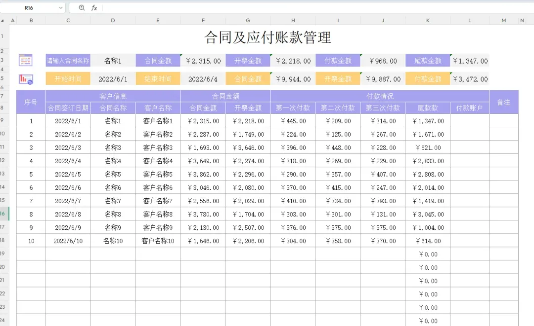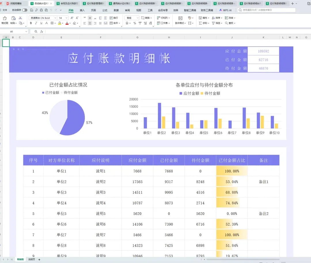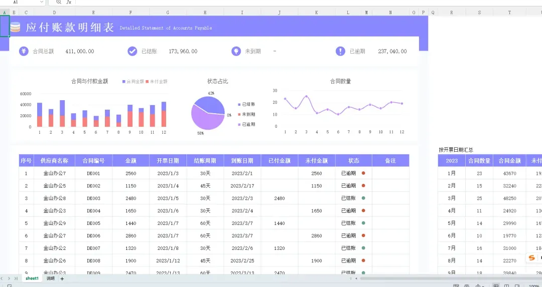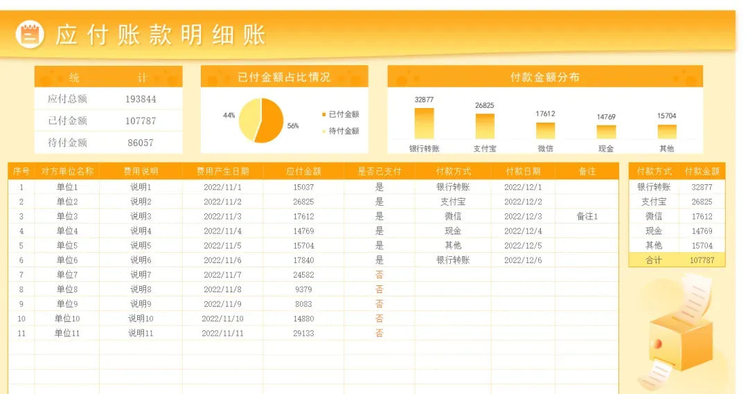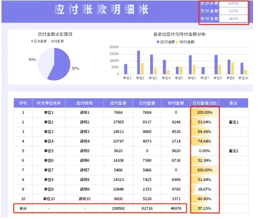 应付账款明细表模板,都是提前设置好了格式、公式!财务人员对应付账款的管理,可以直接带入基础的信息,自动统计应付账款明细,自动生成应付账款报表!不管是财务人员还是老板都能一眼看清楚企业应付账款明细。