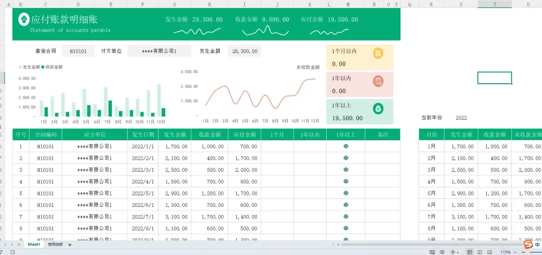下面是常用的应付账款明细表模板操作界面展示,有兴趣的财务人员可以跟着小丫一起看看。操作简单,直接修改基础数据套用即可。