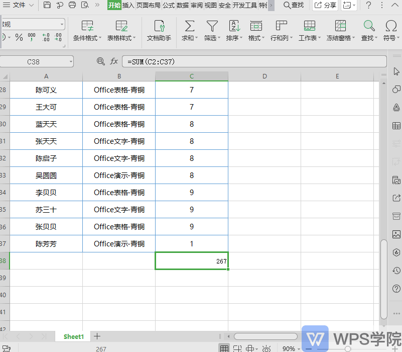 ■ 例如我们要计算这列数据的和,点击开始-求和。