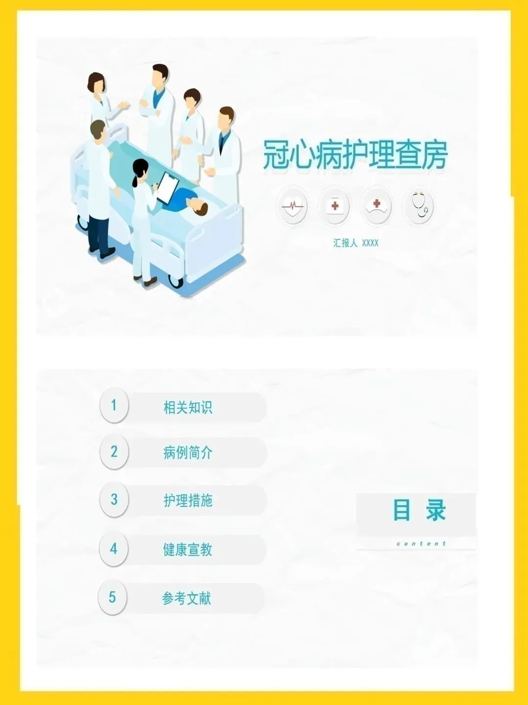 尊敬的各位老师、同事们,大家好。今天我围绕冠心病护理查房进行汇报,主要涵盖疾病知识、病例概况、护理措施与健康宣教四方面内容。