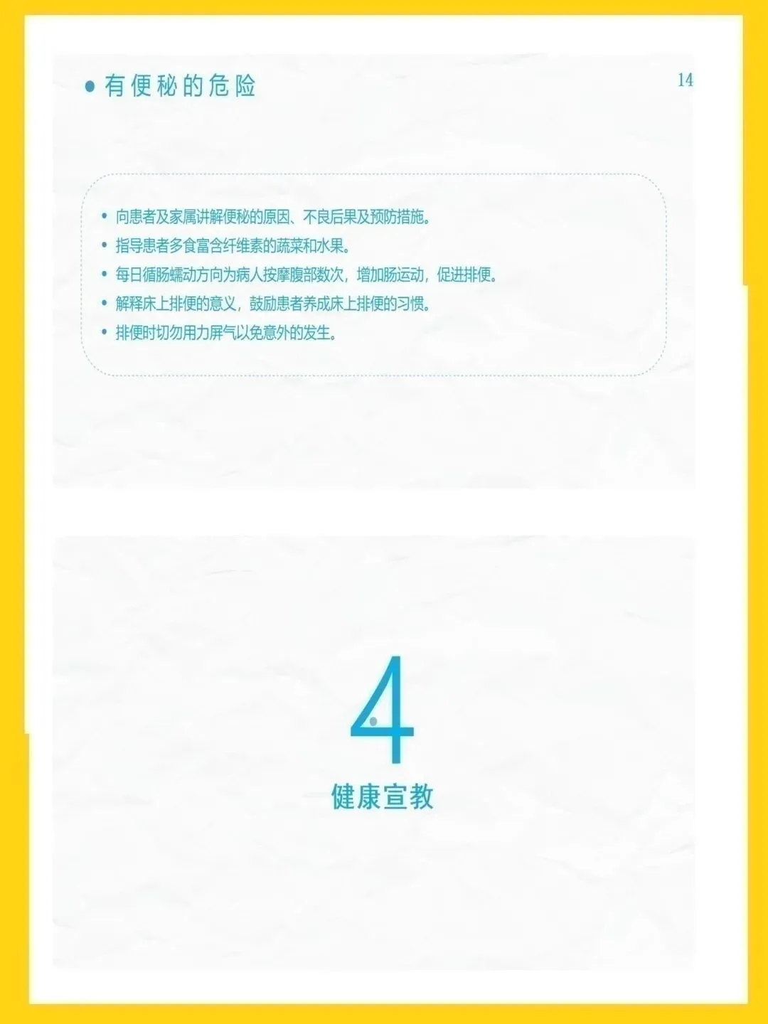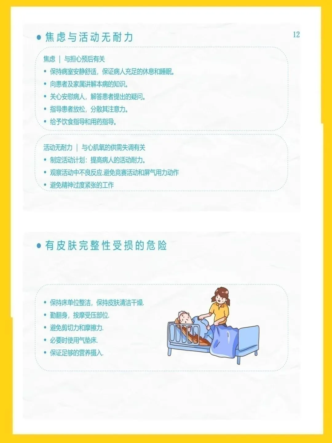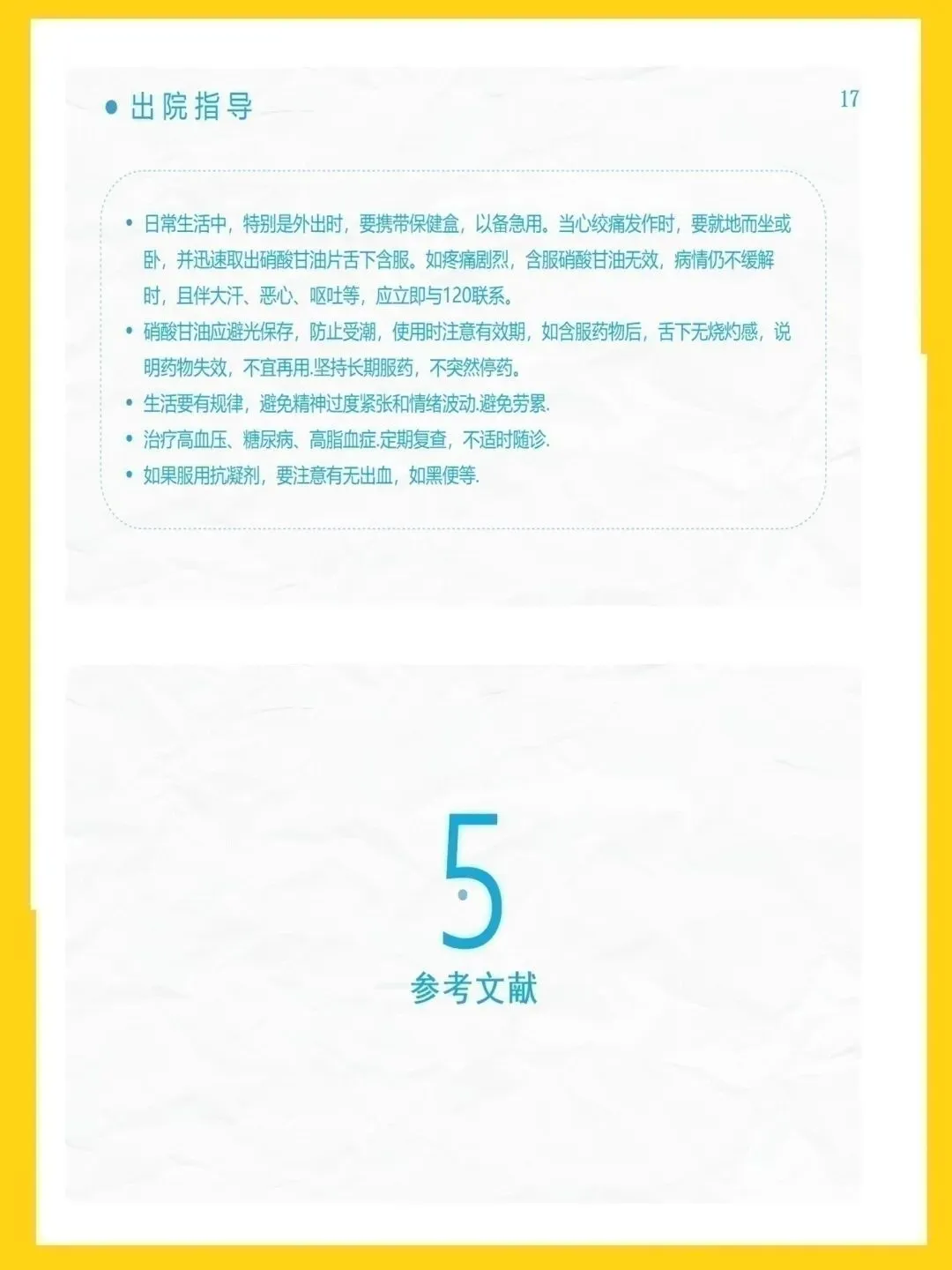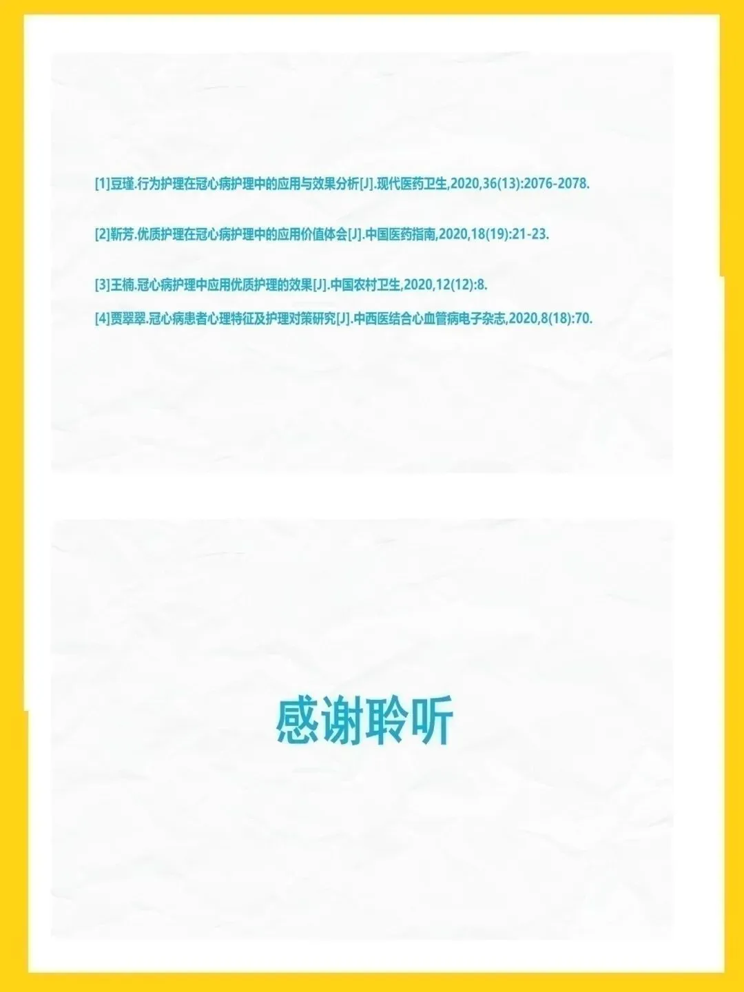 冠心病是冠状动脉粥样硬化致管腔狭窄或阻塞,引发心肌缺血缺氧的心脏病,主要表现为心绞痛与心肌梗死,高血压、吸烟等为可控危险因素。本次查房患者为82岁男性,因胸闷心悸气促入院,诊断为冠心病、高血压3级极高危、痛风等,伴心房颤动、肾功能不全,病情复杂且高危。针对患者病情,我们重点实施疼痛护理、心理干预与活动指导,加强皮肤与排便管理,预防并发症,改善心肌供氧,提升患者舒适度与安全性。健康宣教以低盐低脂饮食、戒烟限酒、适度运动为核心,指导患者合理用药、自我监测与应急处理,帮助建立健康生活方式。出院后需规律服药、定期复查,随身携带急救药物,警惕胸痛等症状,出现不适及时就医,降低疾病复发与加重风险。本次护理查房汇报完毕,感谢大家聆听,敬请批评指正。