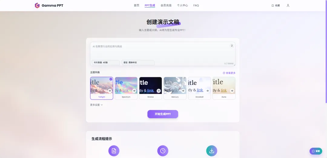 Gamma是目前最智能的AI PPT生成工具,只需要输入主题,就能自动生成完整的课件,包括内容、排版、配色、图片,全部自动完成。