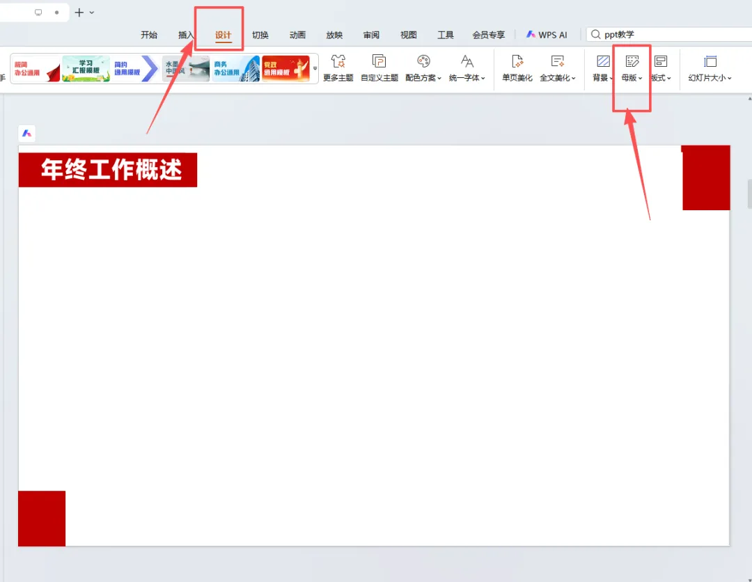 1.打开/新建幻灯片,点击菜单栏中的「设计」选项卡,选择「母版」,进入母版编辑界面。