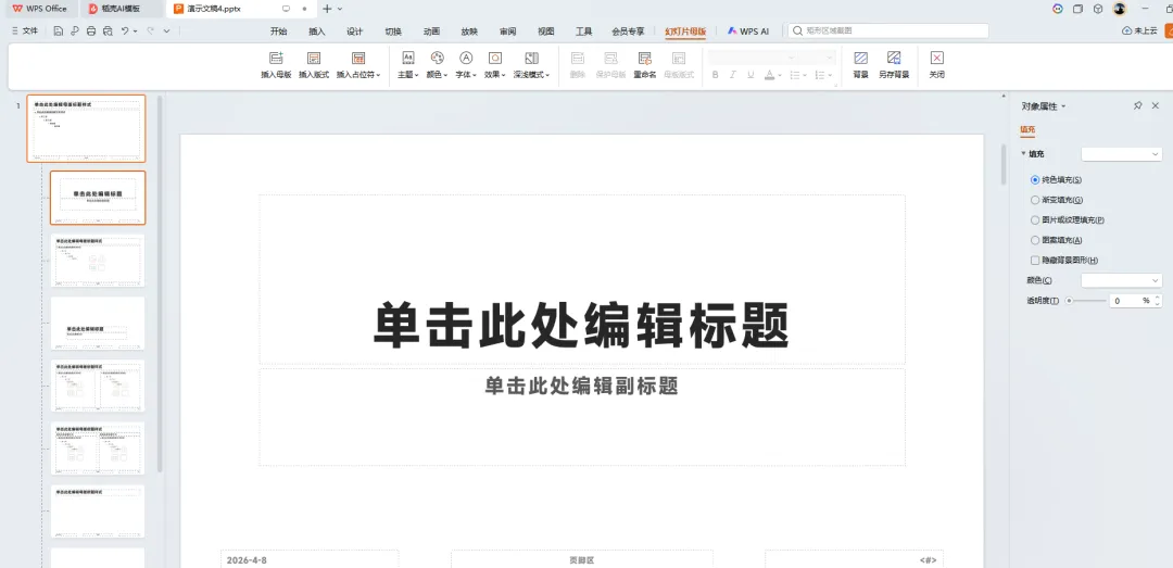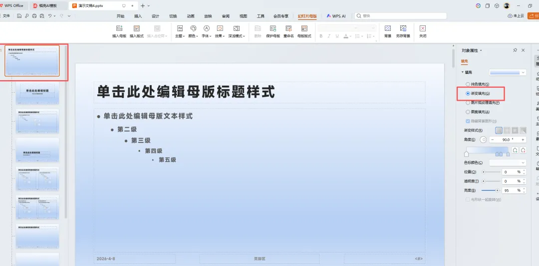 可在此设置背景颜色、背景图片、字体样式、标题和正文格式、页眉页脚等全局元素。例如,通过「填充」选择渐变填充。