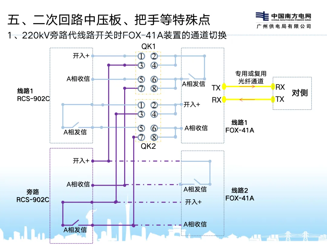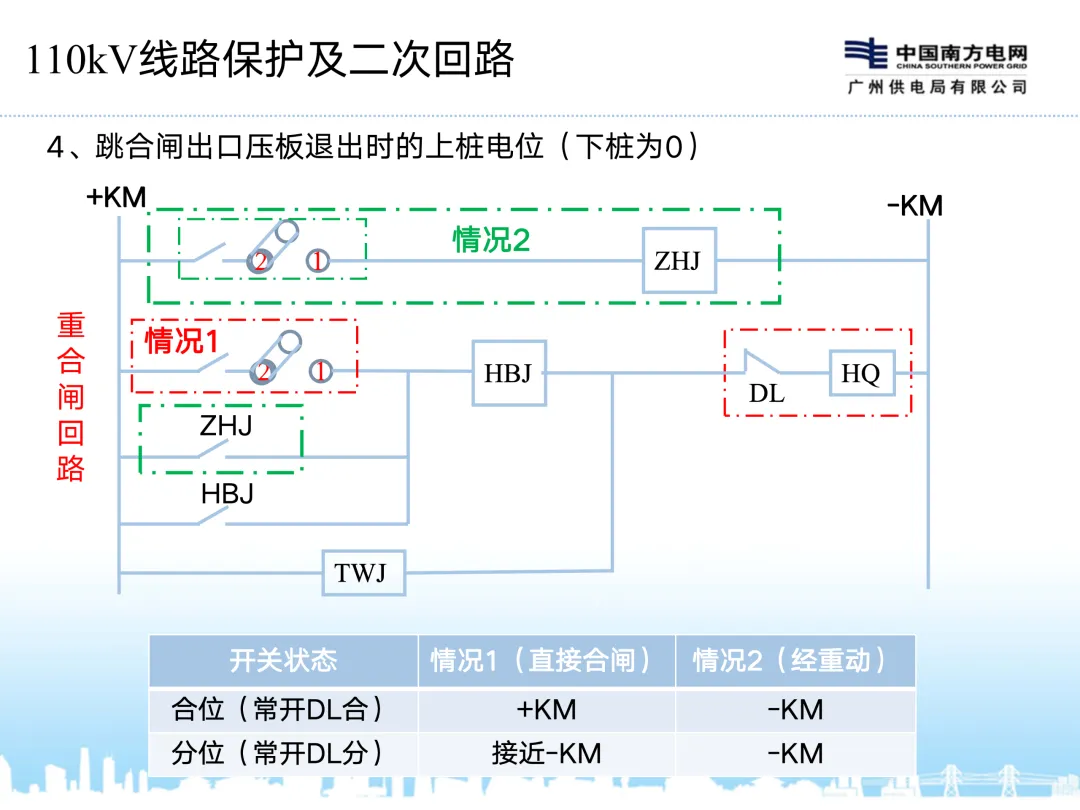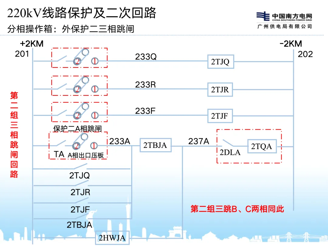 2、配置独立的断路器操作箱及电压切换箱,操作箱含一组合闸回路、两组跳闸回路,两套保护分别出口动作于一组跳闸回路;对于分相操作的线路断路器,操作箱相应配置分相的跳合闸回路,实现单跳单重功能;操作箱还应提供两套与线路保护、失灵保护配合的断路器位置、远跳、闭重、三跳起失灵等相关接点;