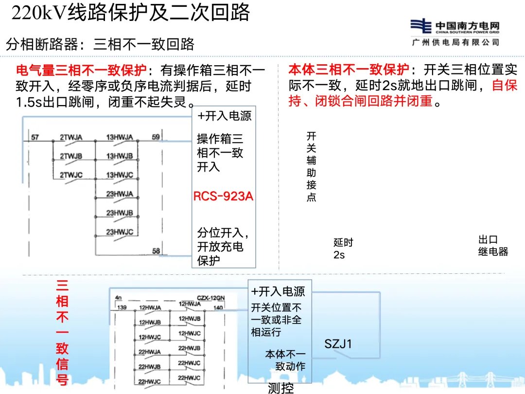 4、分相操作的断路器配置本体三相不一致,宜配置两套压力闭锁回路取消操作箱的压力闭锁回路,只保留操作箱的压力低闭重回路。