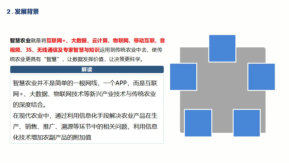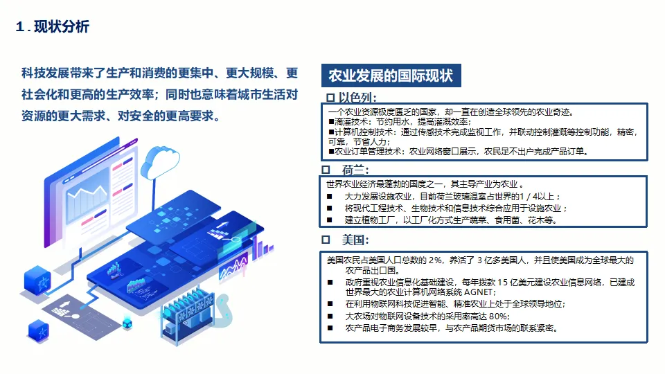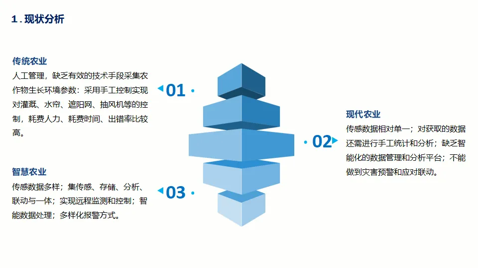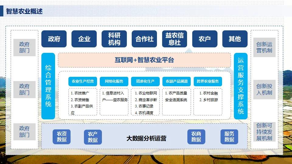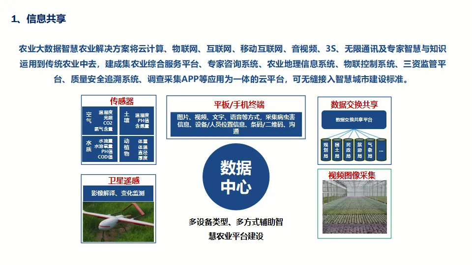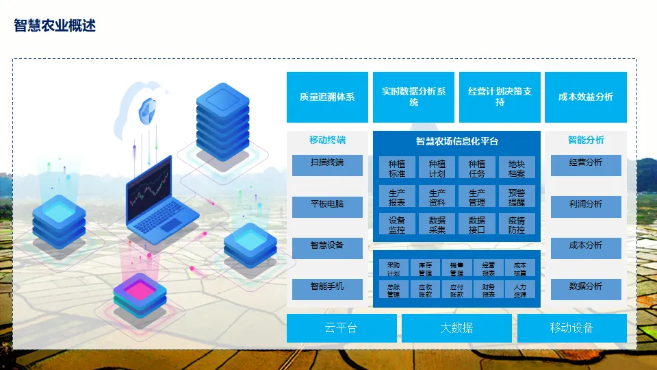 本方案立足传统农业生产分散、融资难、流通成本高、信息不对称等痛点,融合3S技术、物联网、大数据、云计算与移动互联,构建集监测、管控、运营、决策于一体的智慧农业体系,助力农业规模化、精准化、智能化升级。 方案以智慧农场信息化平台为核心,覆盖生产管理、设备监控、数据采集、质量追溯、财务库存、人力预警等全流程功能,通过多类型传感器、卫星遥感、视频采集等手段,实现空气、土壤、水质、作物长势等数据实时获取。依托云平台实现数据高效存储、共享与安全防护,采用P2DR安全模型保障网络与数据安全,支持PC、手机、平板等多终端便捷访问。 方案打造物联网设备层、数据中心层、应用系统层、大数据分析层四层架构,提供智能监控、精准作业、病虫害防控、应急指挥、质量溯源、移动农业执法、电商销售等场景化应用,实现从种植到销售全链条数字化管控。同时建立完善运营管理体系,覆盖财务、预算、资产、绩效等模块,提升农业经营效率。 方案已在大型种植基地成功落地,实现全程精细化管理与产品溯源。具备易操作、多终端适配、高集成、强安全等优势,提供全周期实施与迭代服务。方案贴合国家乡村振兴与数字农业政策导向,以科技赋能农业产业升级,帮助农户增收、保障农产品安全,推动传统农业向智慧农业转型。