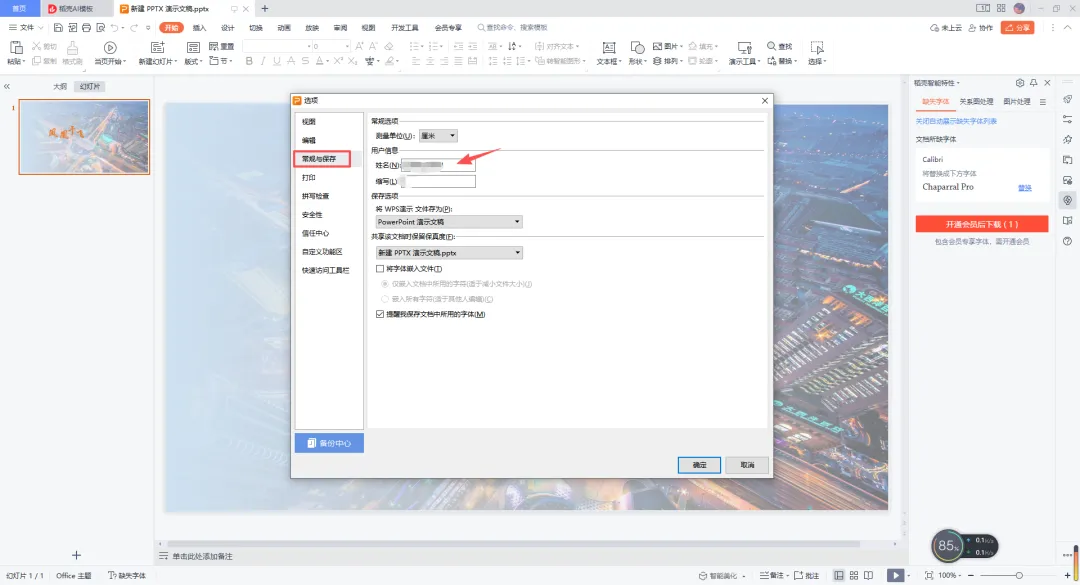 2.在弹出框中,点击左侧栏【常规与保存】,输入姓名和缩写,点击确定即可,之后新建的所有Office文件(PPT/Word/Excel)都会默认用这个名字作为作者。方法二:文件夹属性直接修改(无需打开PPT,最快)
