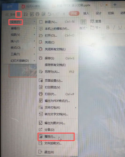 1. 打开PPT文件,点击左上角文件旁边的向下箭头→ 进入【属性】页面