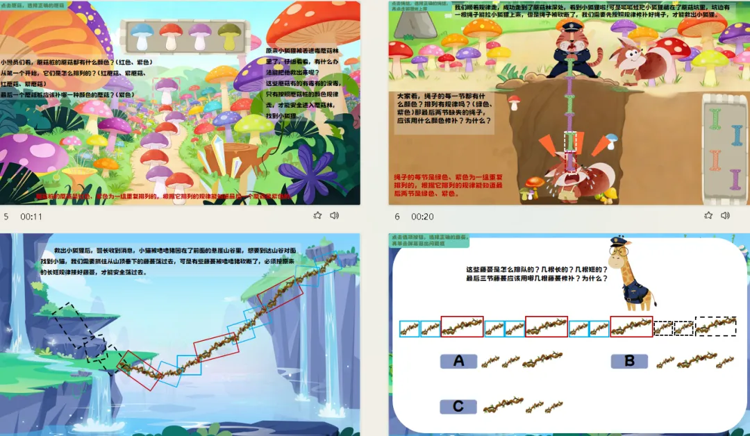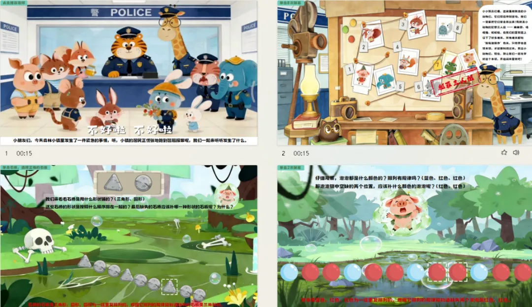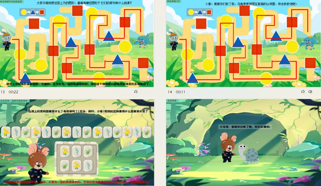 师:小小警员们看,这就是被抓走的小动物们,它们现在特别害怕,我们一定要把它们安全救出来!而抓走小动物的犯罪三人组—— 幽幽狼、噜噜猪、呱呱蛙,在我们的营救路上设下了好多难关。所有难关都和‘按规律排序’有关,只有学会这项本领,才能顺利闯过关,救出小动物们,现在,就让我们一起先学好这个本领,开启闯关营救吧!