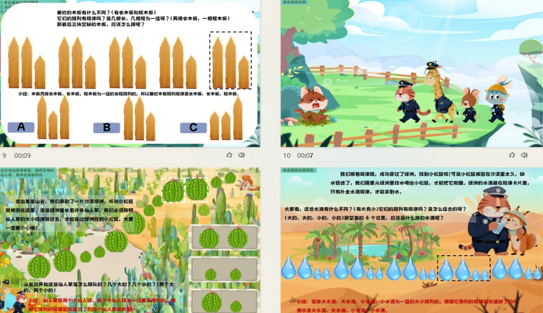 师:各位小警员,我们的第一站来到了森林沼泽,这里是通往森林深处的唯一入口,可是长颈鹿警长发现,通过沼泽地的石桥,被幽幽狼破坏了,石板少了好几块,想要顺利通过,需要按照规律把石板铺好,才能继续前进。